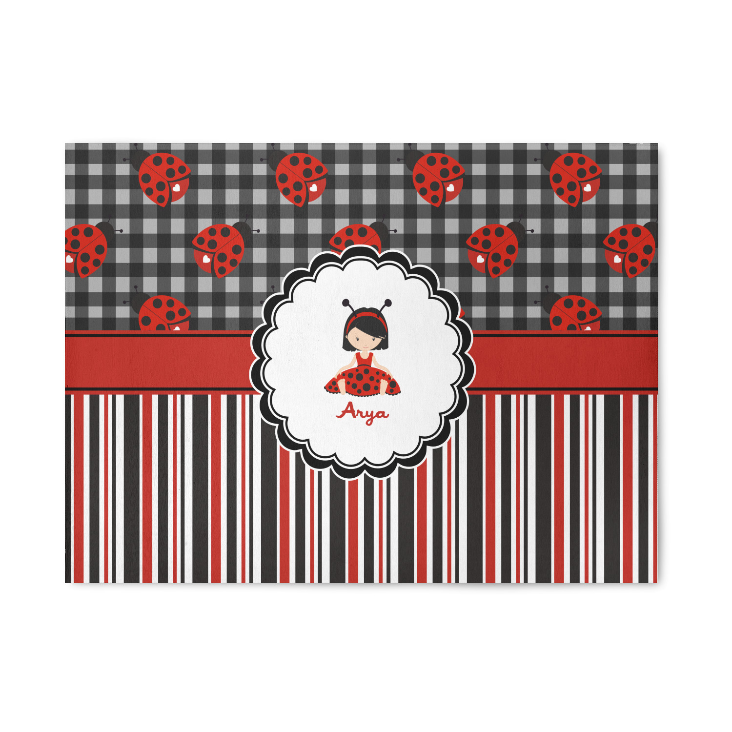 A wide band of red with an inset of black trim pulls the design together. A cute little girl dressed as a ladybug sits in the middle of a white scalloped circle label that is trimmed in double rows of black. Under the ladybug girl is ample room for custom personalization.