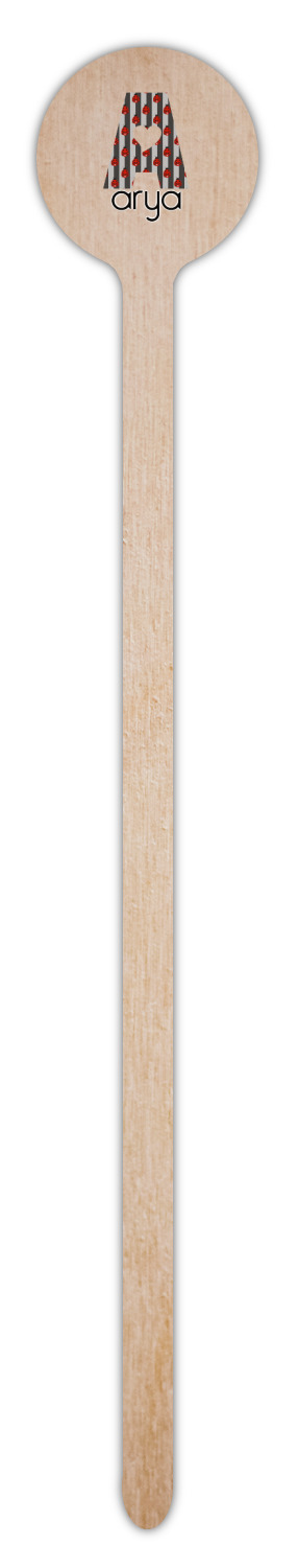A wide band of red with an inset of black trim pulls the design together. A cute little girl dressed as a ladybug sits in the middle of a white scalloped circle label that is trimmed in double rows of black. Under the ladybug girl is ample room for custom personalization.