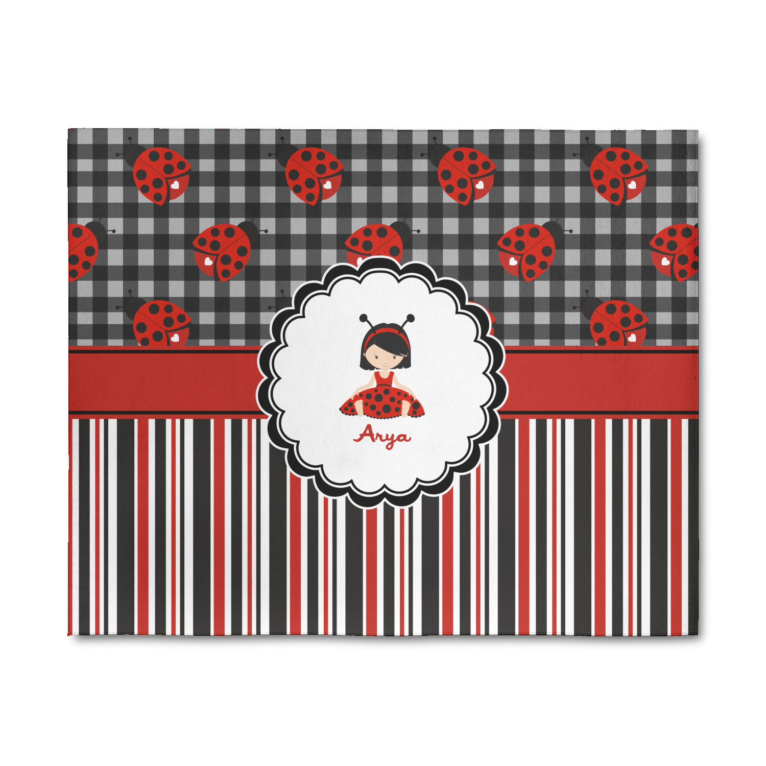 A wide band of red with an inset of black trim pulls the design together. A cute little girl dressed as a ladybug sits in the middle of a white scalloped circle label that is trimmed in double rows of black. Under the ladybug girl is ample room for custom personalization.