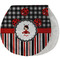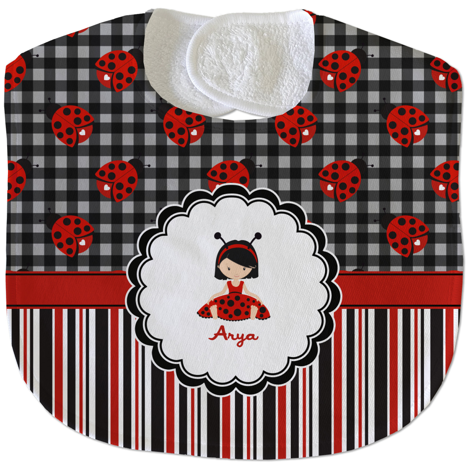 A wide band of red with an inset of black trim pulls the design together. A cute little girl dressed as a ladybug sits in the middle of a white scalloped circle label that is trimmed in double rows of black. Under the ladybug girl is ample room for custom personalization.