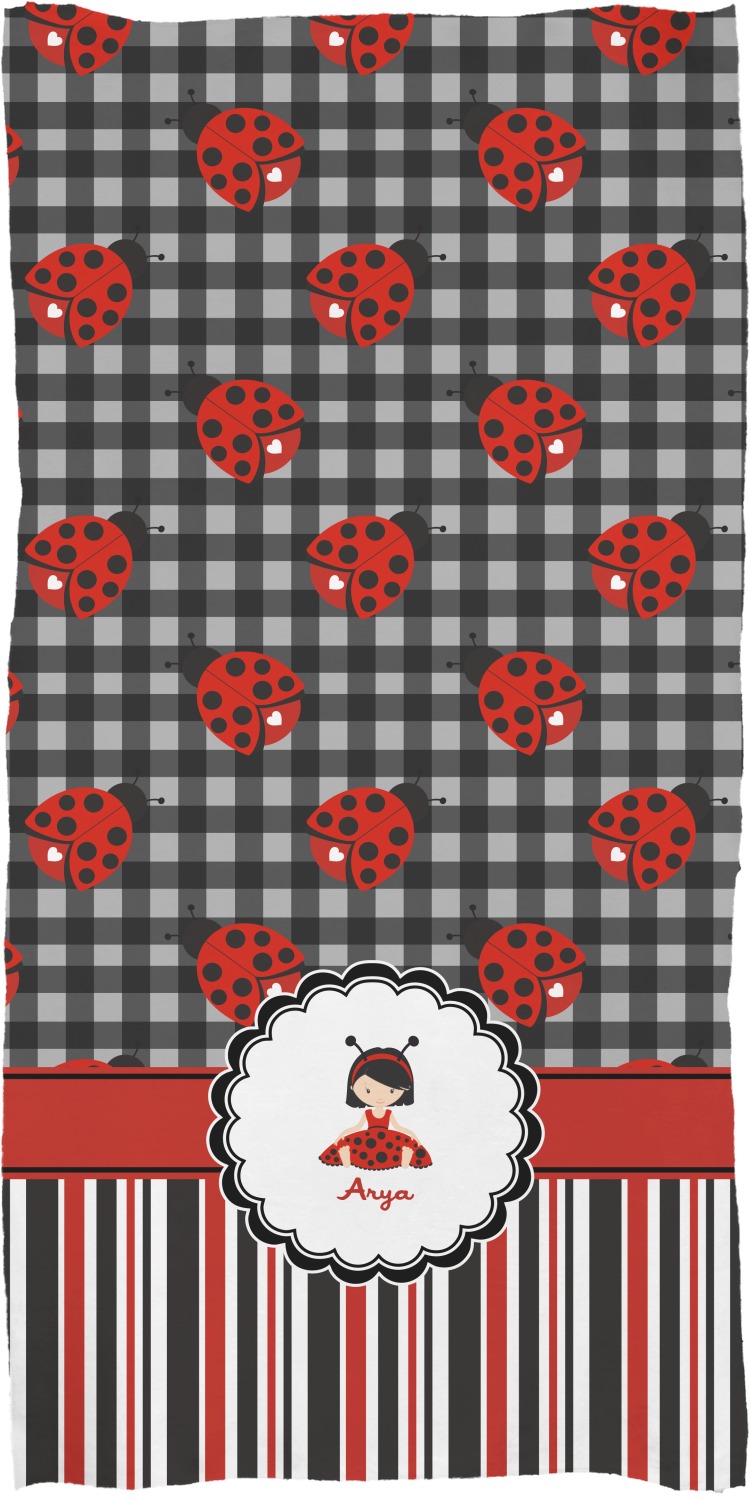 A wide band of red with an inset of black trim pulls the design together. A cute little girl dressed as a ladybug sits in the middle of a white scalloped circle label that is trimmed in double rows of black. Under the ladybug girl is ample room for custom personalization.