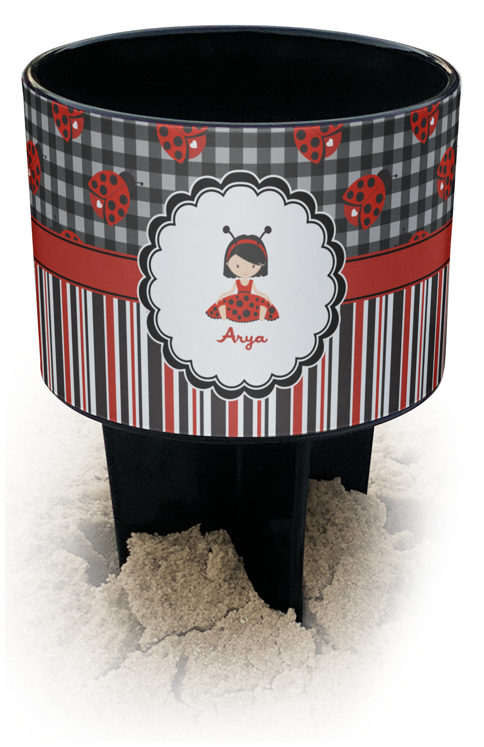 This cup holder has a large stake at its bottom that anchors it to the sand or ground below, while the cup holder rests above the stake. The entire drink holder is made of durable plastic and displays your customization around the cup holder portion. We sell these personalized beach spikers in two different colors: black and white.