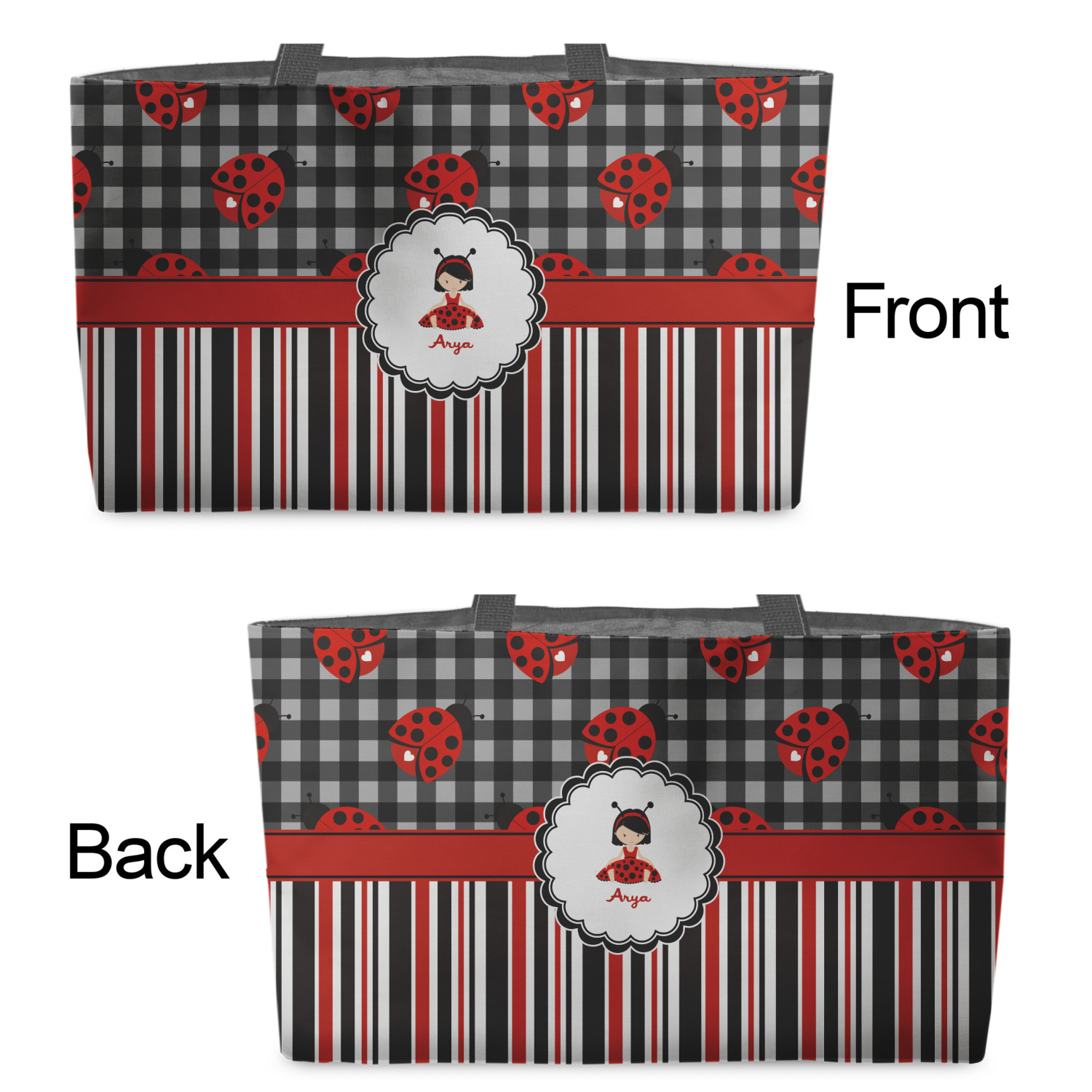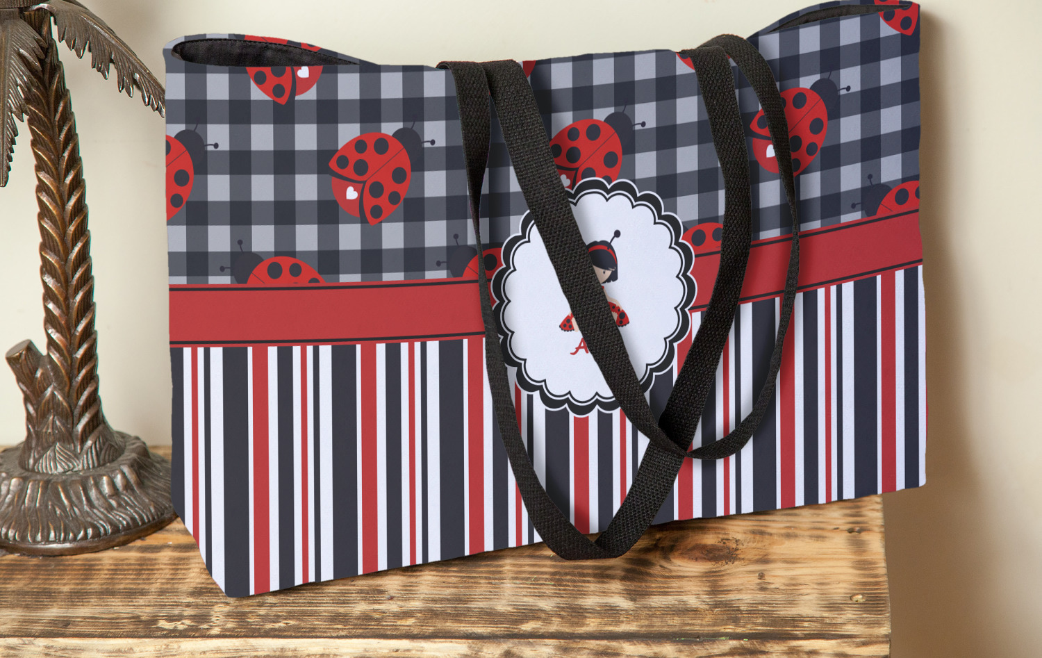 A wide band of red with an inset of black trim pulls the design together. A cute little girl dressed as a ladybug sits in the middle of a white scalloped circle label that is trimmed in double rows of black. Under the ladybug girl is ample room for custom personalization.