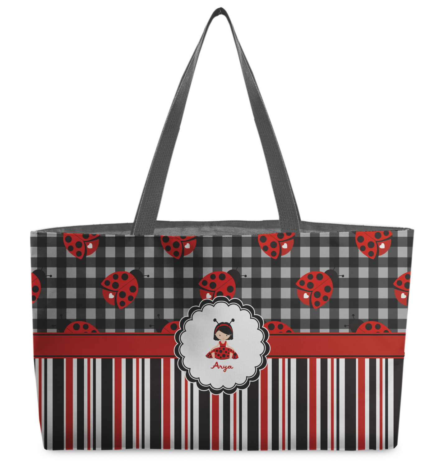 These beach totes are handmade here in the USA. Fabric is printed with your design. The tote is then sewn from the fabric pieces, lining and handles added.