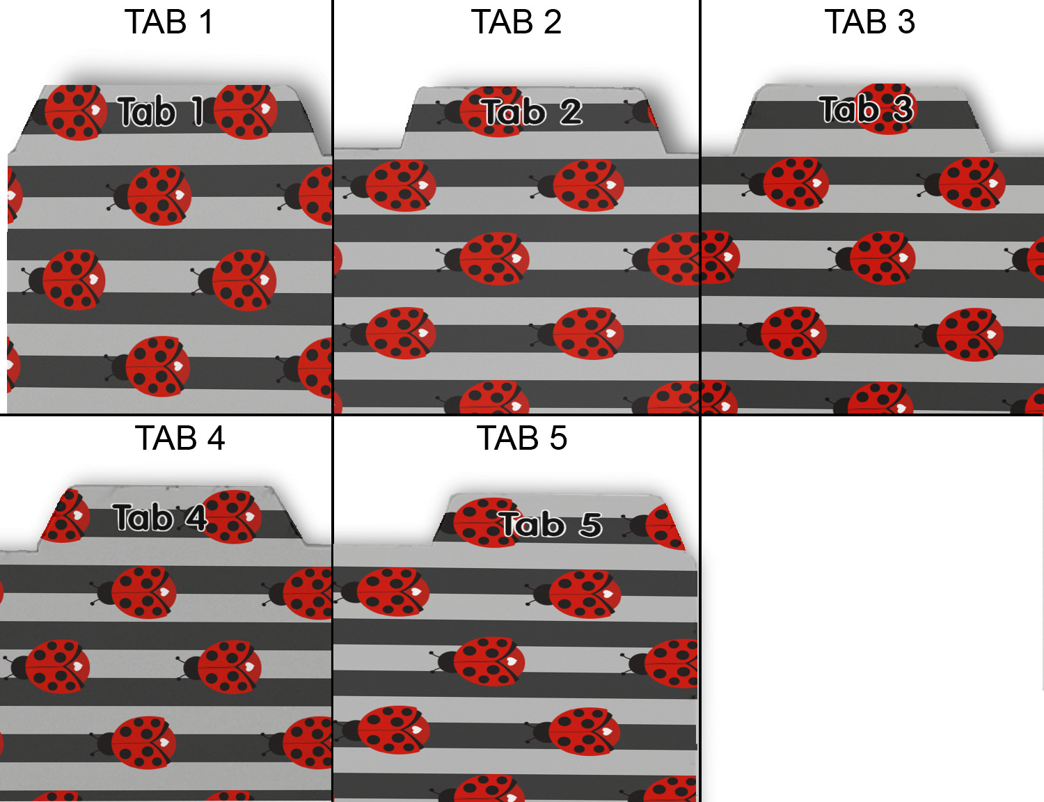 Whether you use binders at school or at work, we have designs to suit all of them. Available in 5 or 6 tab sets, you are sure to find a set to suit your needs. The back of each one is white and can be used to take notes, write vital information on, etc.