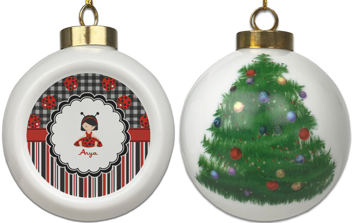 Our Christmas ornaments are a unique ceramic ball shape with a twist as it has a flat face to display your custom design! Select from one of our two design types - Christmas Tree or Poinsettia Garland - to adorn the curved back of your personal design. Each ornament measures 3H x 2.5W x 2D accompanied with a gold string accent for finishing touches to hang on your beautiful Christmas tree!