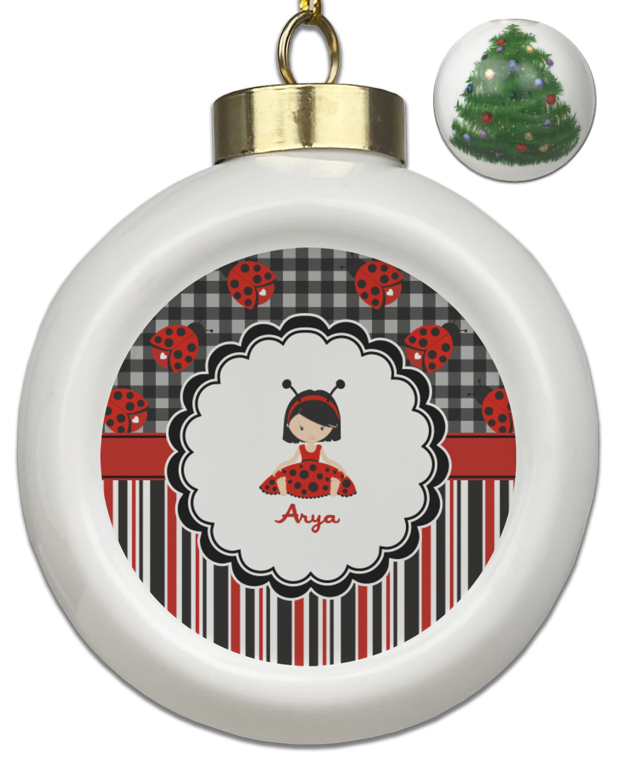 A wide band of red with an inset of black trim pulls the design together. A cute little girl dressed as a ladybug sits in the middle of a white scalloped circle label that is trimmed in double rows of black. Under the ladybug girl is ample room for custom personalization.