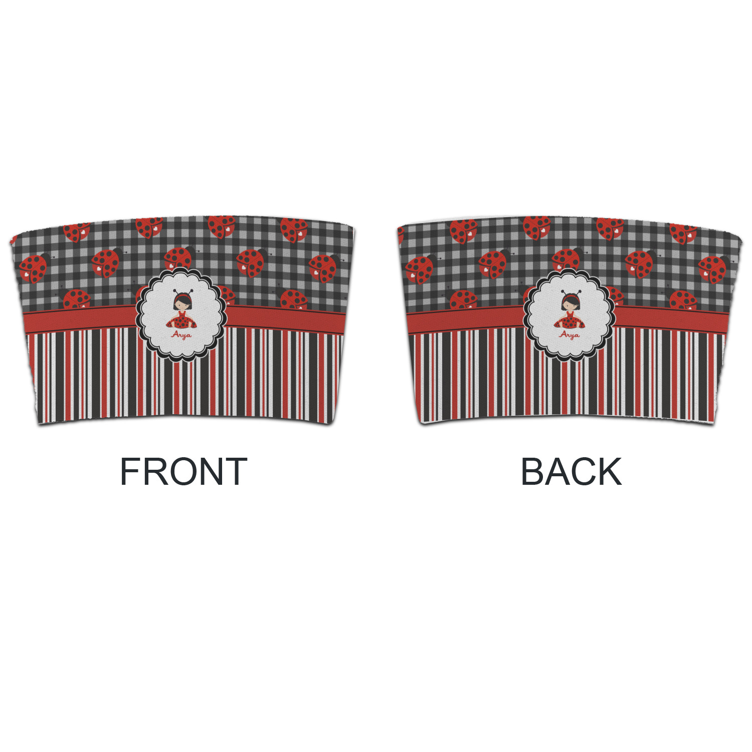 A wide band of red with an inset of black trim pulls the design together. A cute little girl dressed as a ladybug sits in the middle of a white scalloped circle label that is trimmed in double rows of black. Under the ladybug girl is ample room for custom personalization.