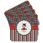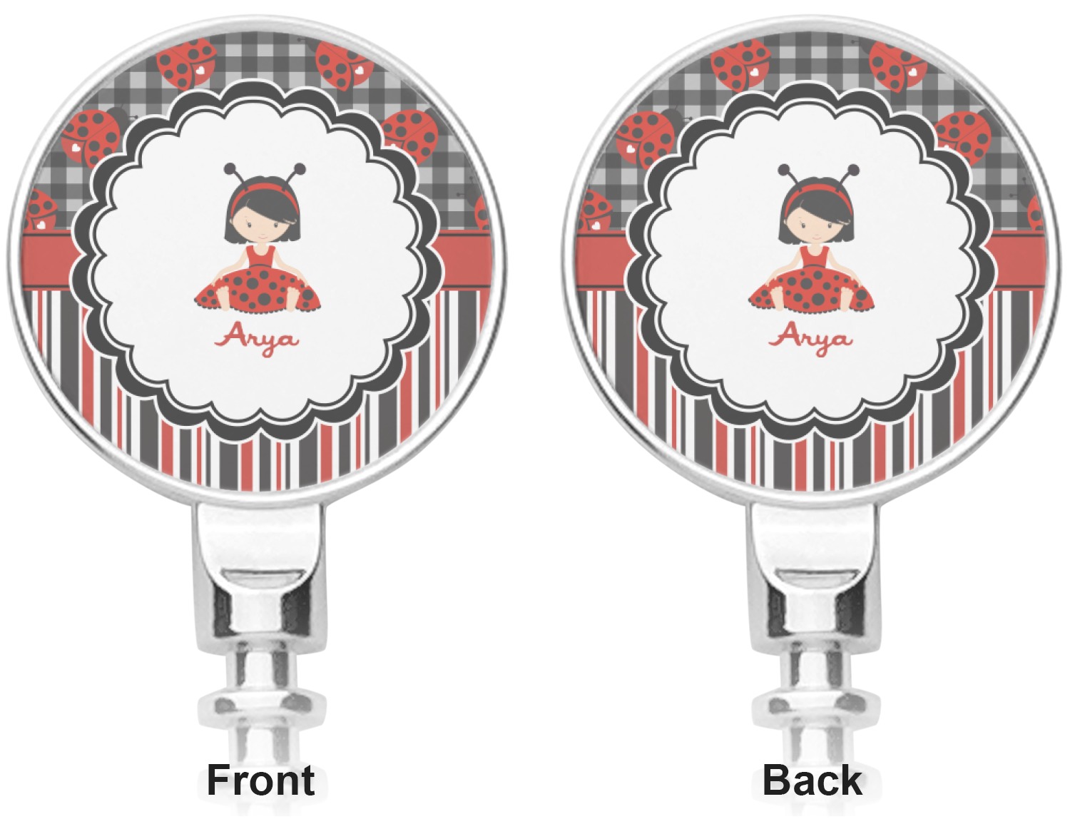 A wide band of red with an inset of black trim pulls the design together. A cute little girl dressed as a ladybug sits in the middle of a white scalloped circle label that is trimmed in double rows of black. Under the ladybug girl is ample room for custom personalization.