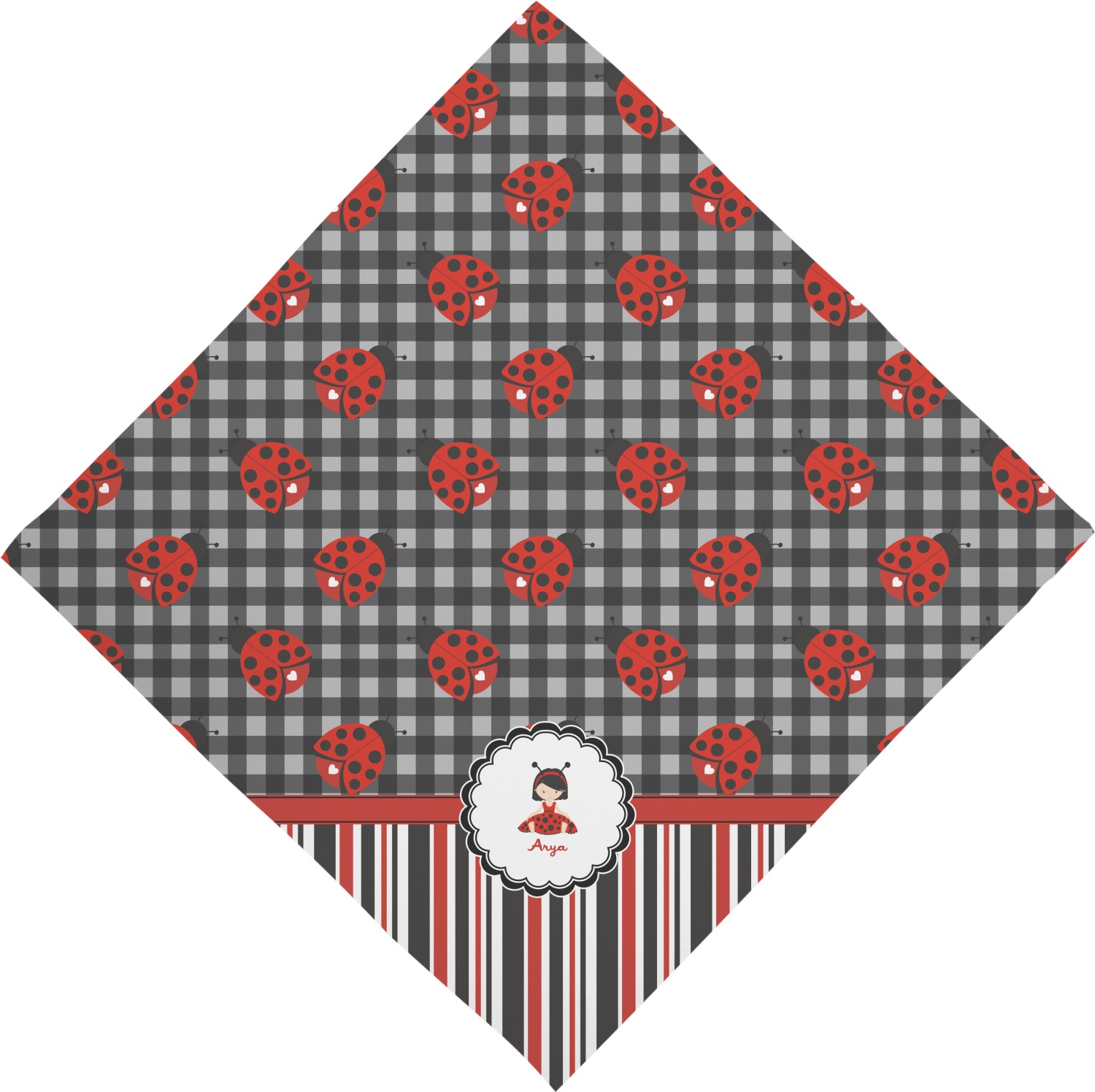Ladybugs stand for luck so why not start your little one off surrounded by the symbol of luck. On the top part of the design our classic ladybugs each feature a heart and are set on a black gingham pattern. To stay with the classic black, red, and white theme a striped pattern has been added to the bottom to coordinate with the gingham pattern on top.
