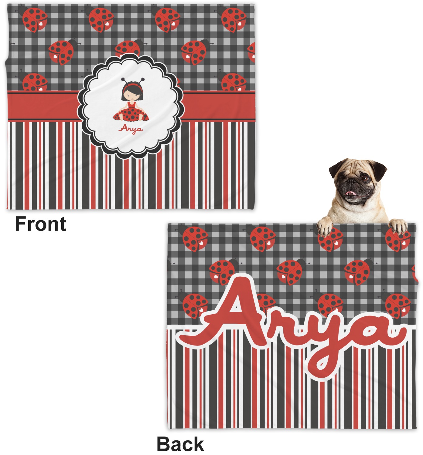 These dog blankets are crafted from a gentle, soft-to-the-touch, minky material. We print your customizations, either matching or differing, on both the top and underside of the blanket. These personalized dog blankets are available in two sizes: regular and large. Our regular size, at 40" x 30", accommodates small and some medium size dogs. At 60" x 50", our large dog blanket is a better fit for bigger breeds. Though specialized for dogs, these blankets still make a thoughtful gift for your favorite feline, or any other pet in mind!