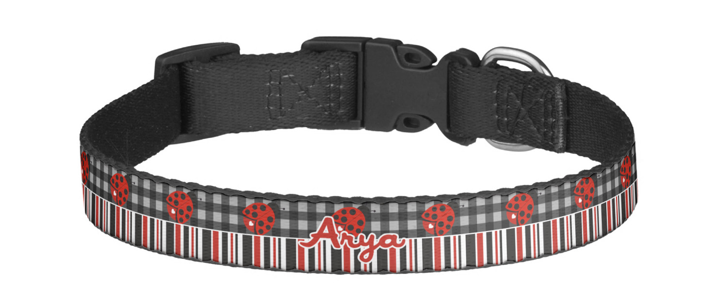 This sturdy collar, made from a durable nylon weave, will outlive your dog's episodes of excited tugging and pulling. Courtesy of its thick plastic buckle and adjuster, this collar is adjustable and accommodating of any dog. Structurally, the collar is a single piece of nylon weave that is sewn together, and features a solid metal loop where you can attach a leash or dog tag. We print and display your dog's name and pattern across the middle of the personalized dog collar.