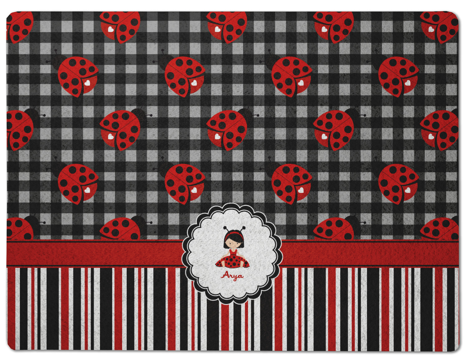 A wide band of red with an inset of black trim pulls the design together. A cute little girl dressed as a ladybug sits in the middle of a white scalloped circle label that is trimmed in double rows of black. Under the ladybug girl is ample room for custom personalization.