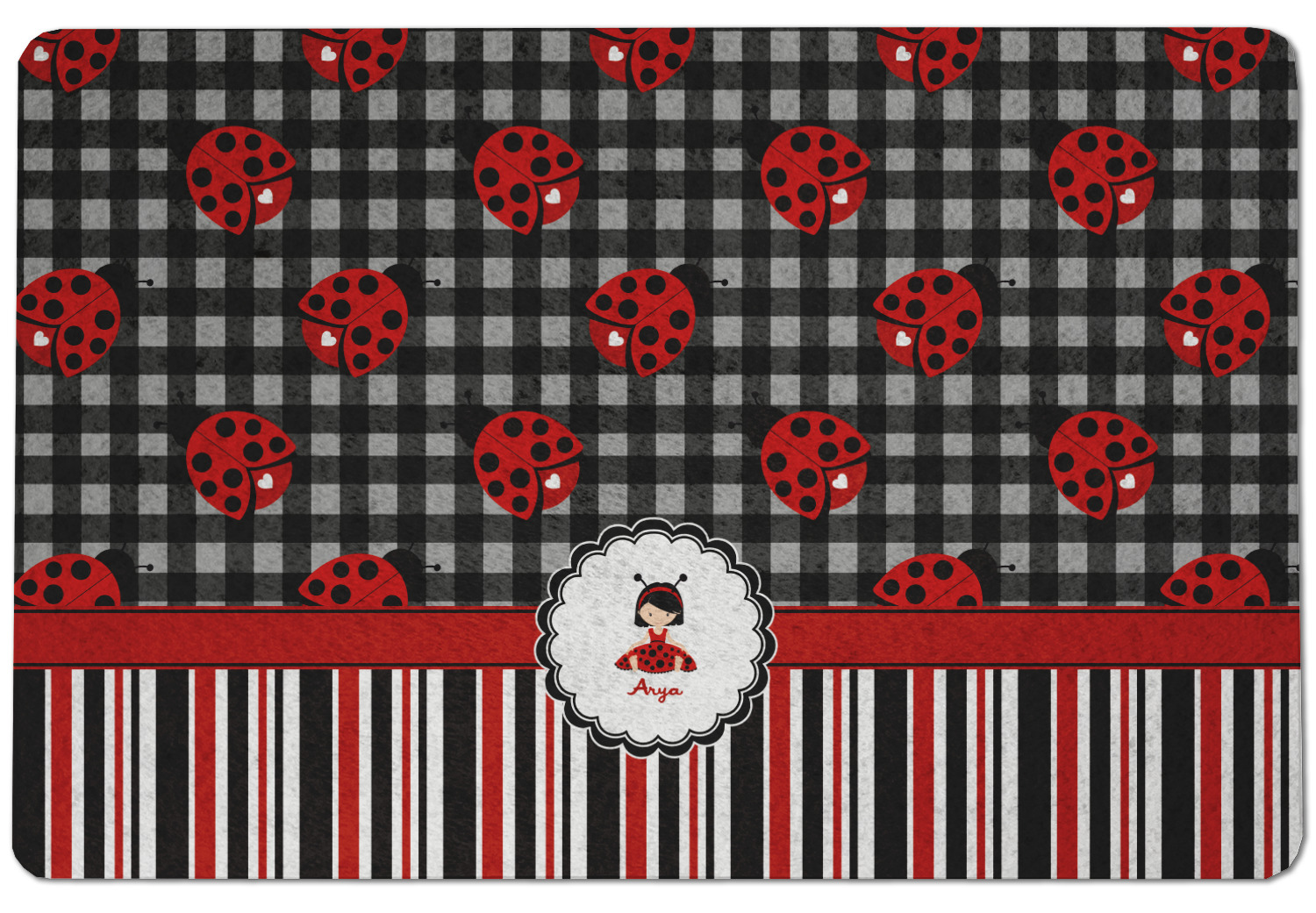 A wide band of red with an inset of black trim pulls the design together. A cute little girl dressed as a ladybug sits in the middle of a white scalloped circle label that is trimmed in double rows of black. Under the ladybug girl is ample room for custom personalization.