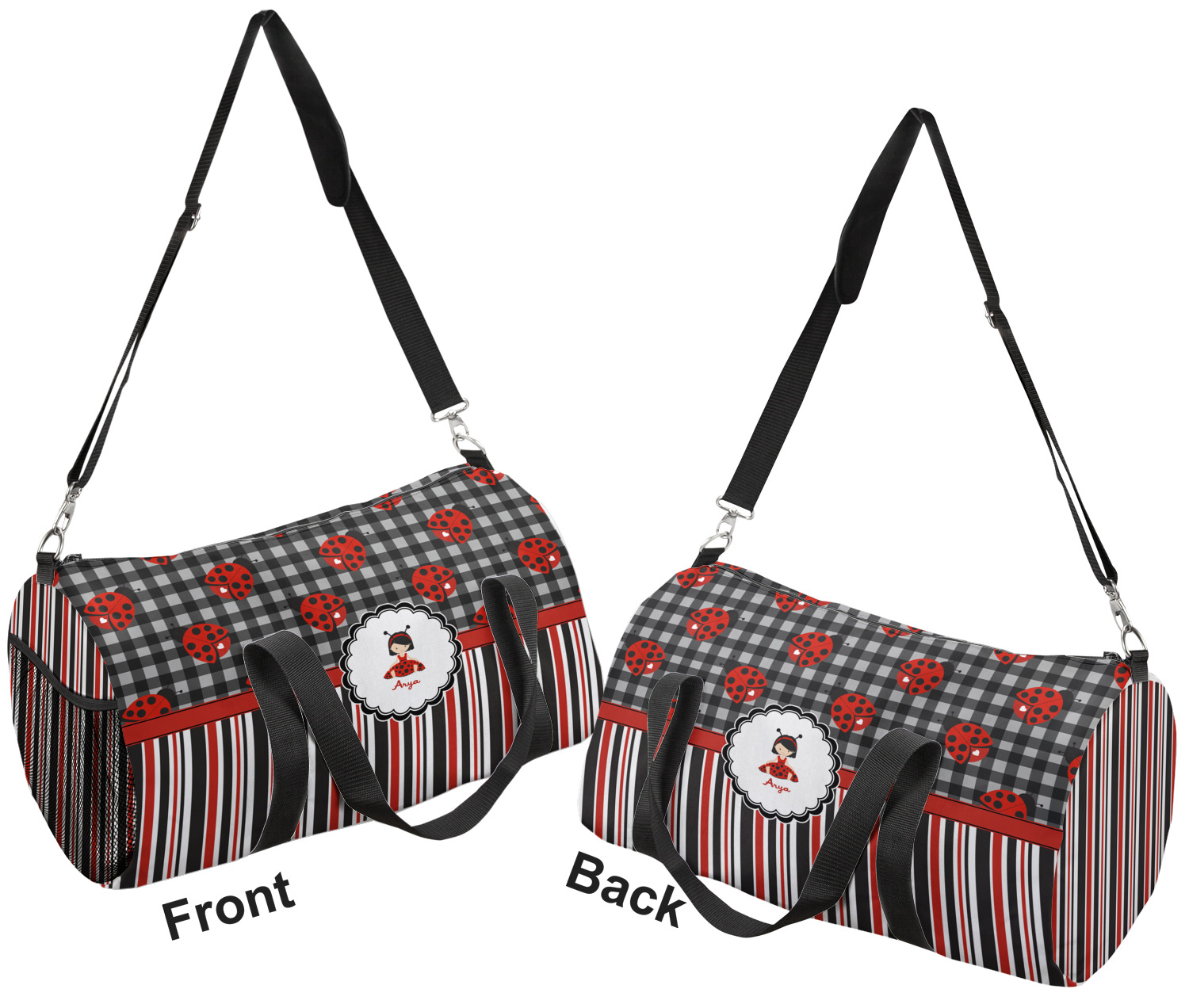 This duffle is a sturdy bag made of a canvas material. It comes in two sizes: Small (19"W x 9.5"H x 9.5"D) and Large (23"W x 12"H x 12"D). The bag is a cylindrical shape with a black adjustable strap and two handles. On one side is an elastic pouch to put a waterbottle or other small item. Your product will be sublimated with your design and is able to be designed on the front, back, and sides. Be sure to remember that the straps may cut into parts of your design if you upload your own artwork.