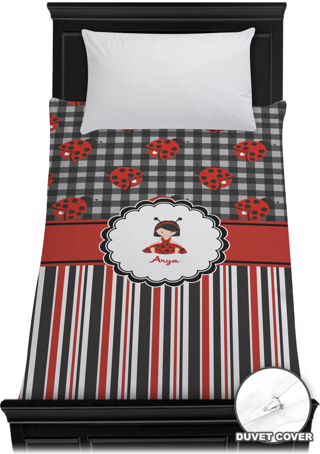 Ladybugs stand for luck so why not start your little one off surrounded by the symbol of luck. On the top part of the design our classic ladybugs each feature a heart and are set on a black gingham pattern. To stay with the classic black, red, and white theme a striped pattern has been added to the bottom to coordinate with the gingham pattern on top.