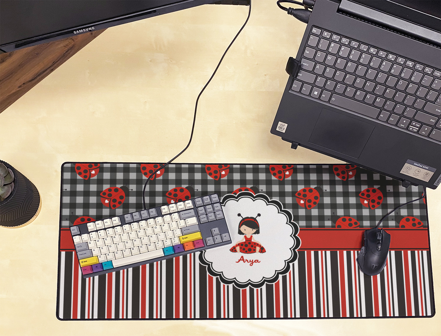 A wide band of red with an inset of black trim pulls the design together. A cute little girl dressed as a ladybug sits in the middle of a white scalloped circle label that is trimmed in double rows of black. Under the ladybug girl is ample room for custom personalization.