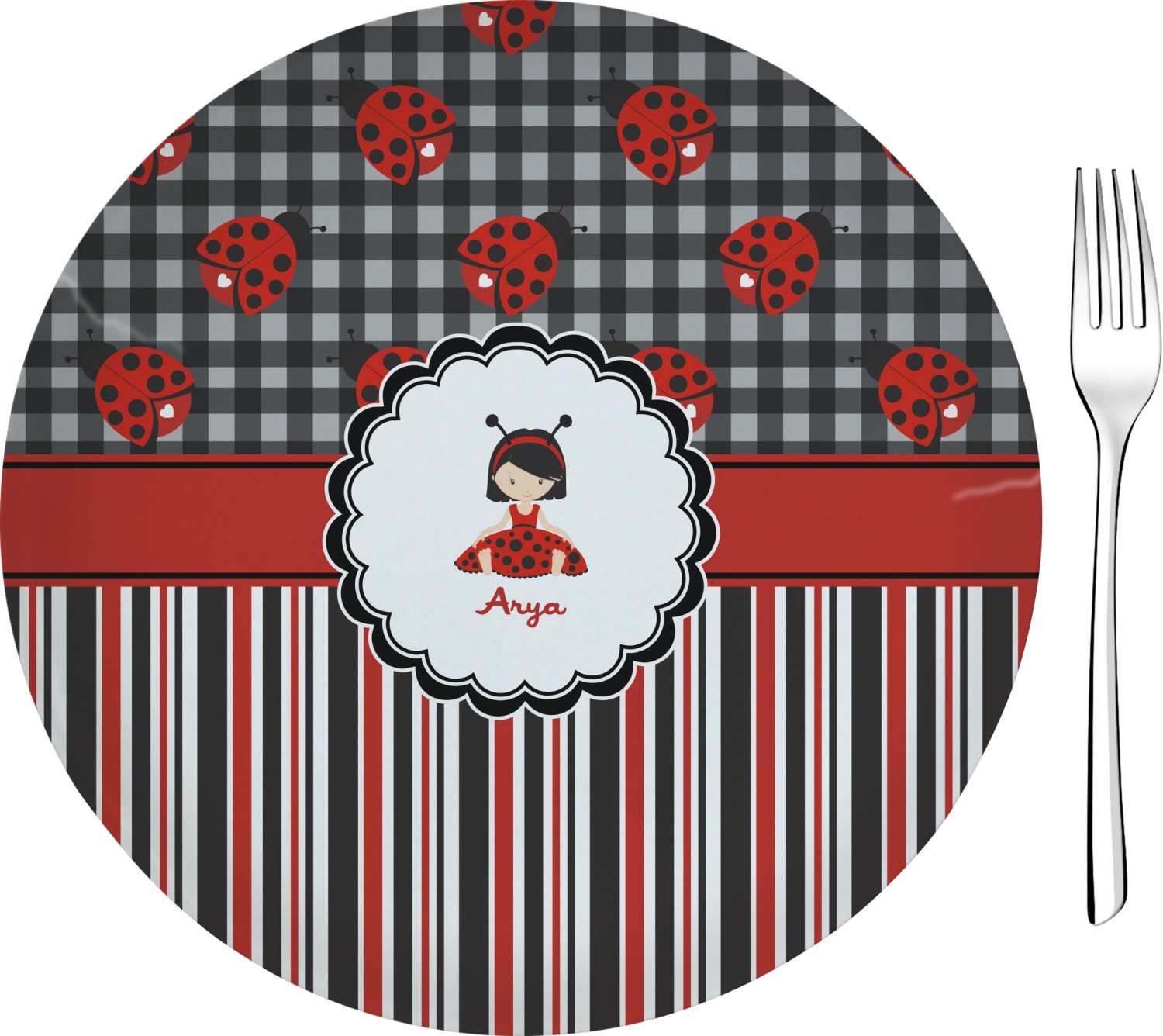 A wide band of red with an inset of black trim pulls the design together. A cute little girl dressed as a ladybug sits in the middle of a white scalloped circle label that is trimmed in double rows of black. Under the ladybug girl is ample room for custom personalization.