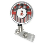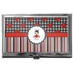 A wide band of red with an inset of black trim pulls the design together. A cute little girl dressed as a ladybug sits in the middle of a white scalloped circle label that is trimmed in double rows of black. Under the ladybug girl is ample room for custom personalization.