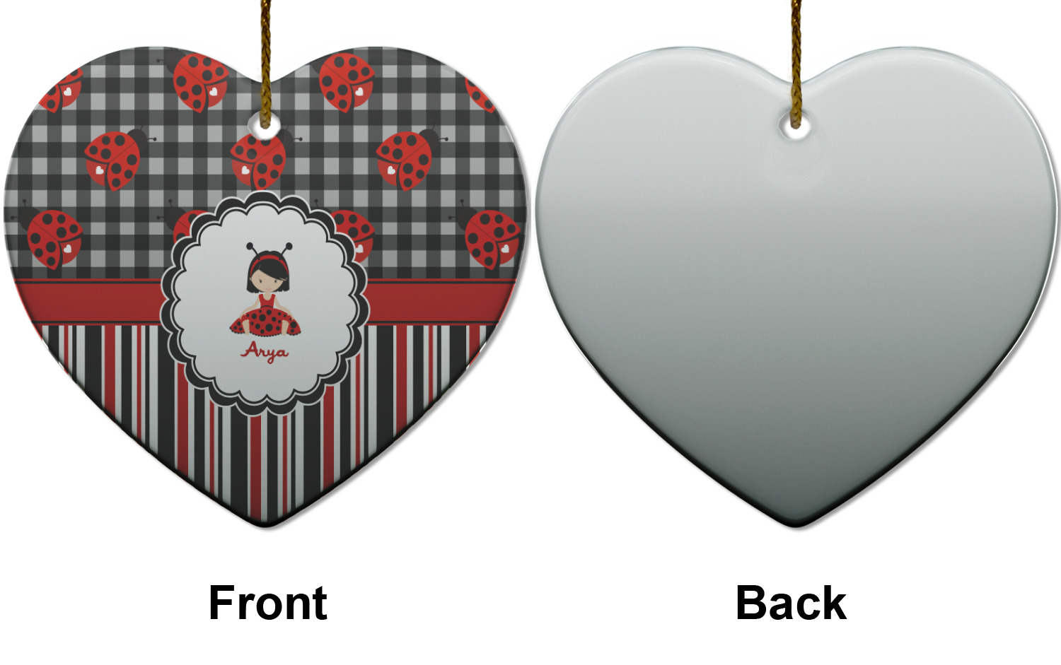 A wide band of red with an inset of black trim pulls the design together. A cute little girl dressed as a ladybug sits in the middle of a white scalloped circle label that is trimmed in double rows of black. Under the ladybug girl is ample room for custom personalization.