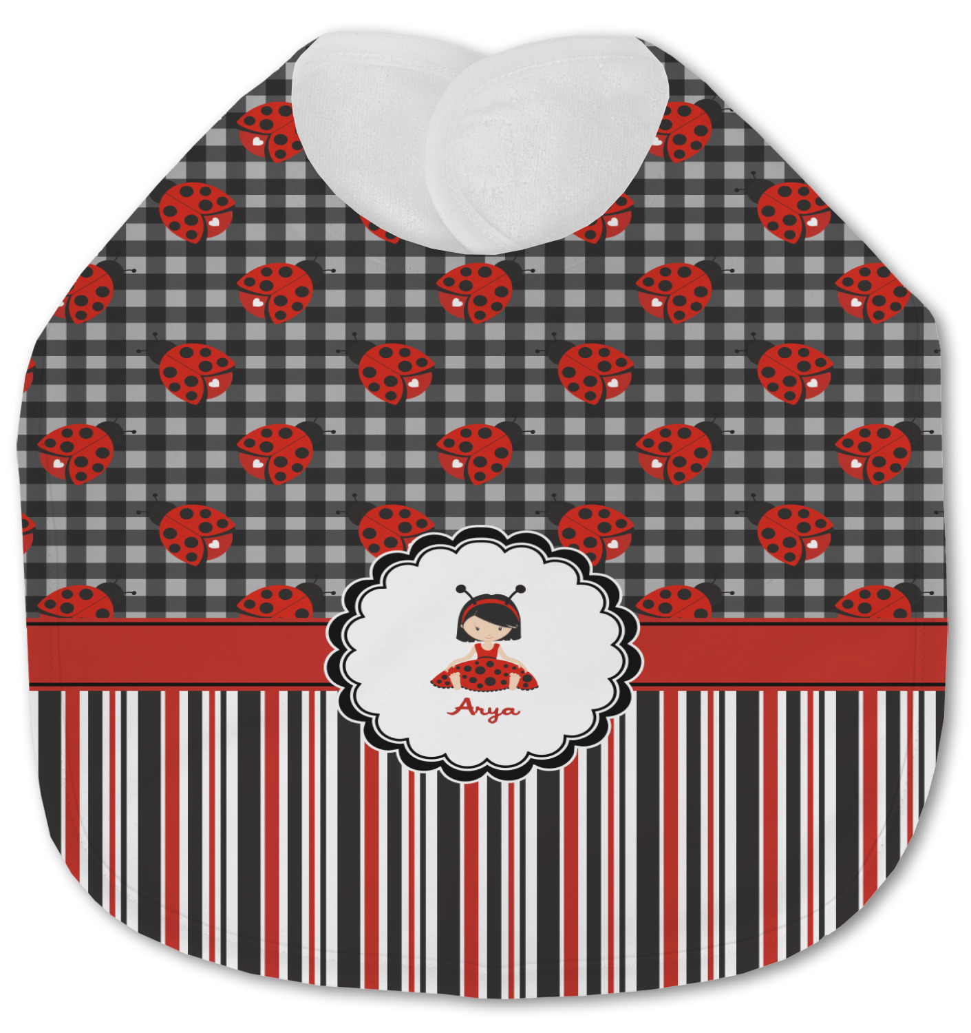 A wide band of red with an inset of black trim pulls the design together. A cute little girl dressed as a ladybug sits in the middle of a white scalloped circle label that is trimmed in double rows of black. Under the ladybug girl is ample room for custom personalization.