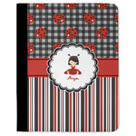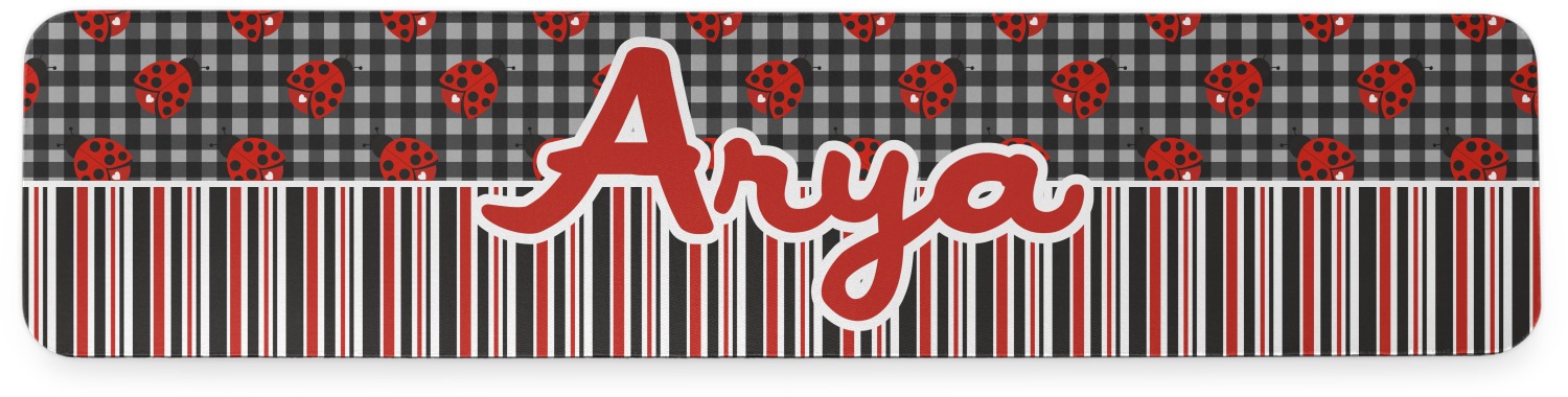 A wide band of red with an inset of black trim pulls the design together. A cute little girl dressed as a ladybug sits in the middle of a white scalloped circle label that is trimmed in double rows of black. Under the ladybug girl is ample room for custom personalization.