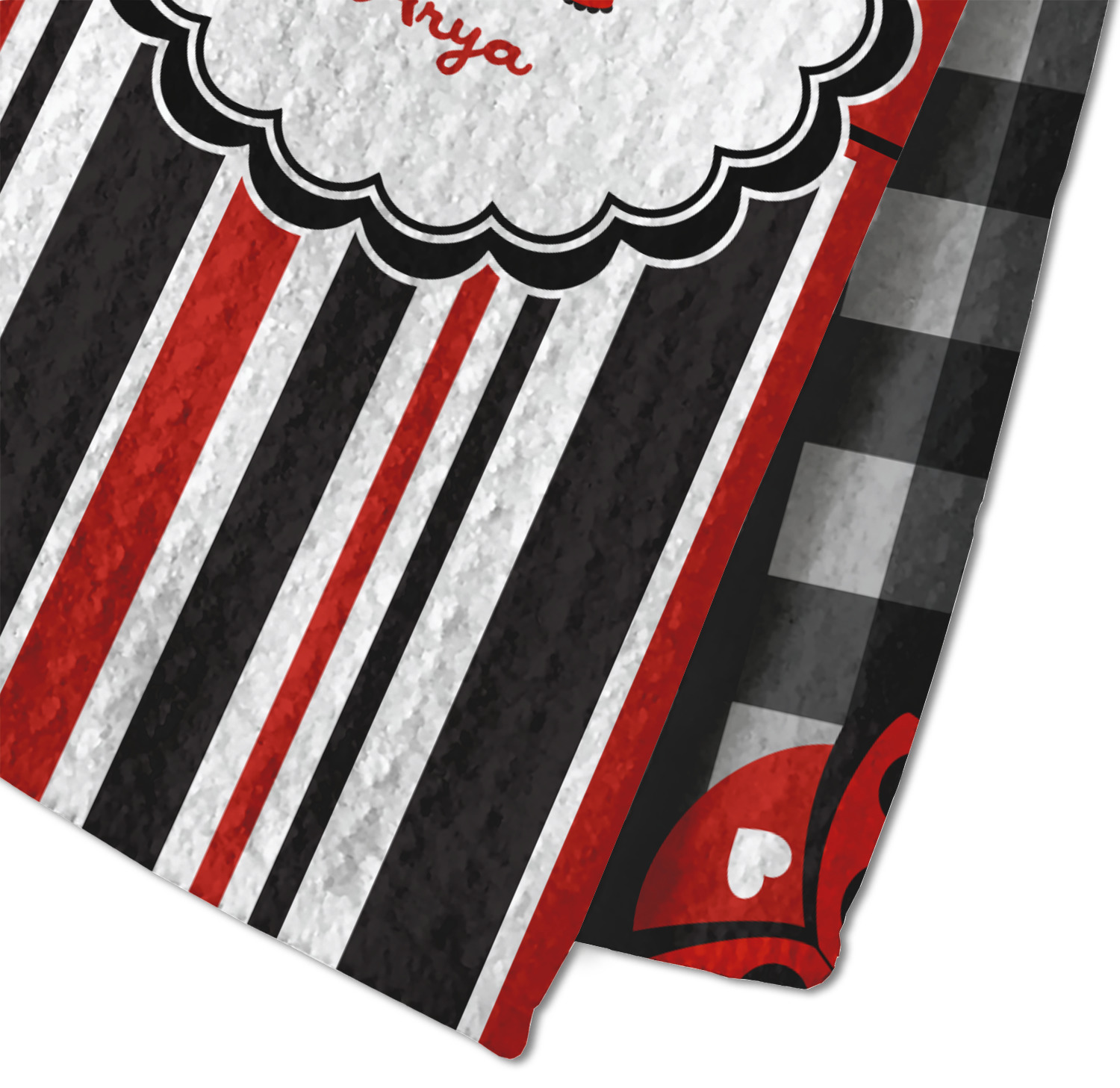 Ladybugs stand for luck so why not start your little one off surrounded by the symbol of luck. On the top part of the design our classic ladybugs each feature a heart and are set on a black gingham pattern. To stay with the classic black, red, and white theme a striped pattern has been added to the bottom to coordinate with the gingham pattern on top.