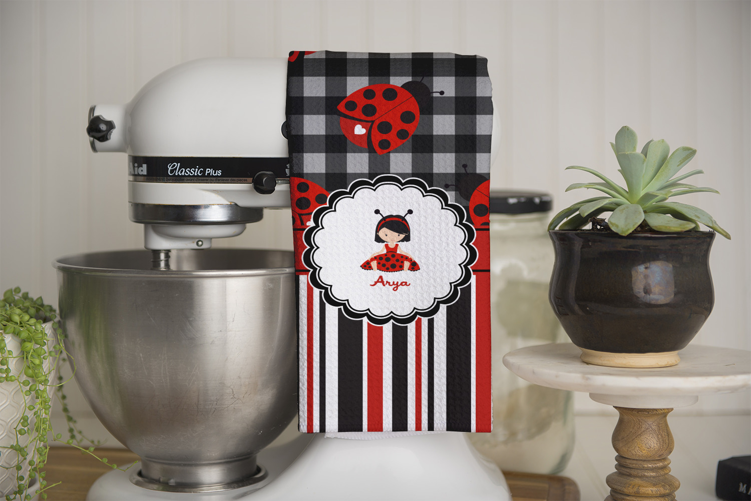 Each waffle weave kitchen towel is approximately 16 x 24 inches with your design printed on one side and the back is white.