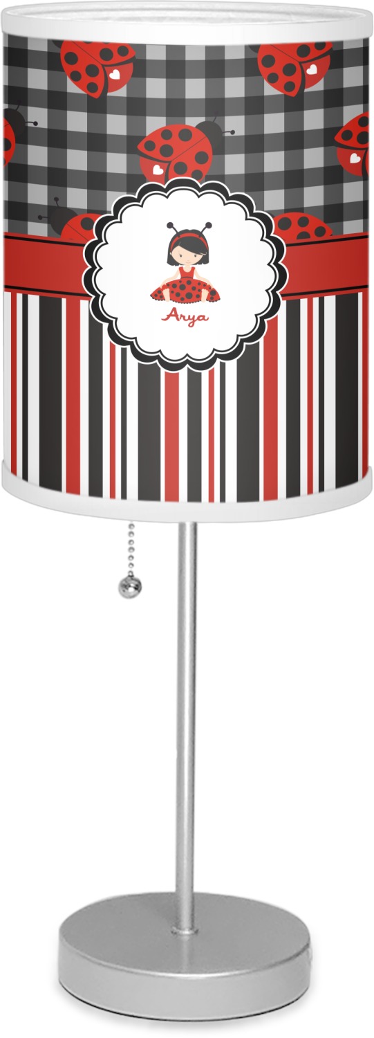 A wide band of red with an inset of black trim pulls the design together. A cute little girl dressed as a ladybug sits in the middle of a white scalloped circle label that is trimmed in double rows of black. Under the ladybug girl is ample room for custom personalization.