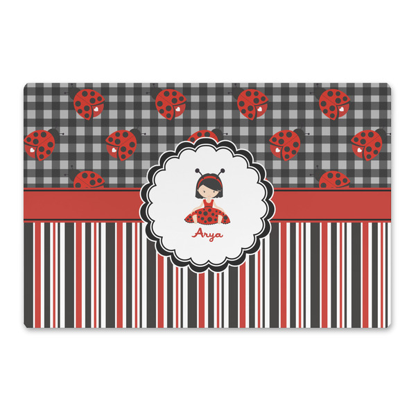 A wide band of red with an inset of black trim pulls the design together. A cute little girl dressed as a ladybug sits in the middle of a white scalloped circle label that is trimmed in double rows of black. Under the ladybug girl is ample room for custom personalization.