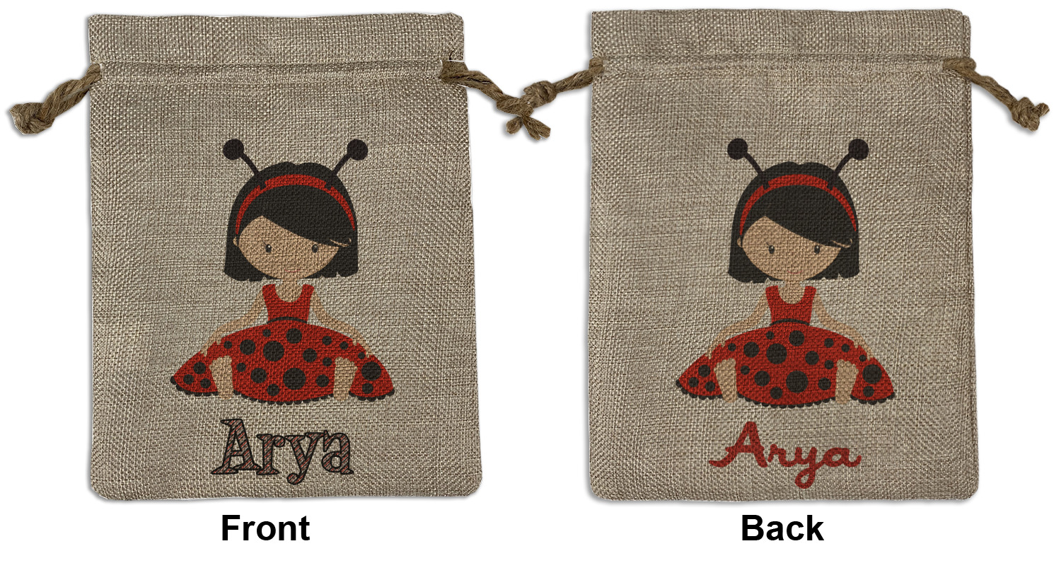 We sell our Burlap Gift Bags in 3 variant sized bags. Made with burlap polyester, each personalized bag can be secured with a twine drawstring pull. Your custom design is available to print on one side or both sides - completely up to you! The sizes of the bags measure approximately 4.5" x 6.5" for the smallest size, 6.5" x 8.0" for the medium size, and 6.5" x 13.5" for the large-sized bag.