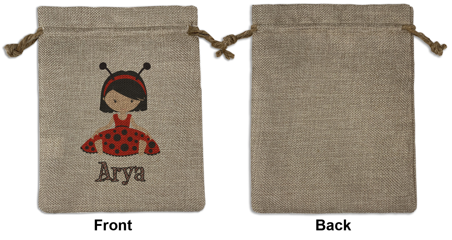 We sell our Burlap Gift Bags in 3 variant sized bags. Made with burlap polyester, each personalized bag can be secured with a twine drawstring pull. Your custom design is available to print on one side or both sides - completely up to you! The sizes of the bags measure approximately 4.5" x 6.5" for the smallest size, 6.5" x 8.0" for the medium size, and 6.5" x 13.5" for the large-sized bag.