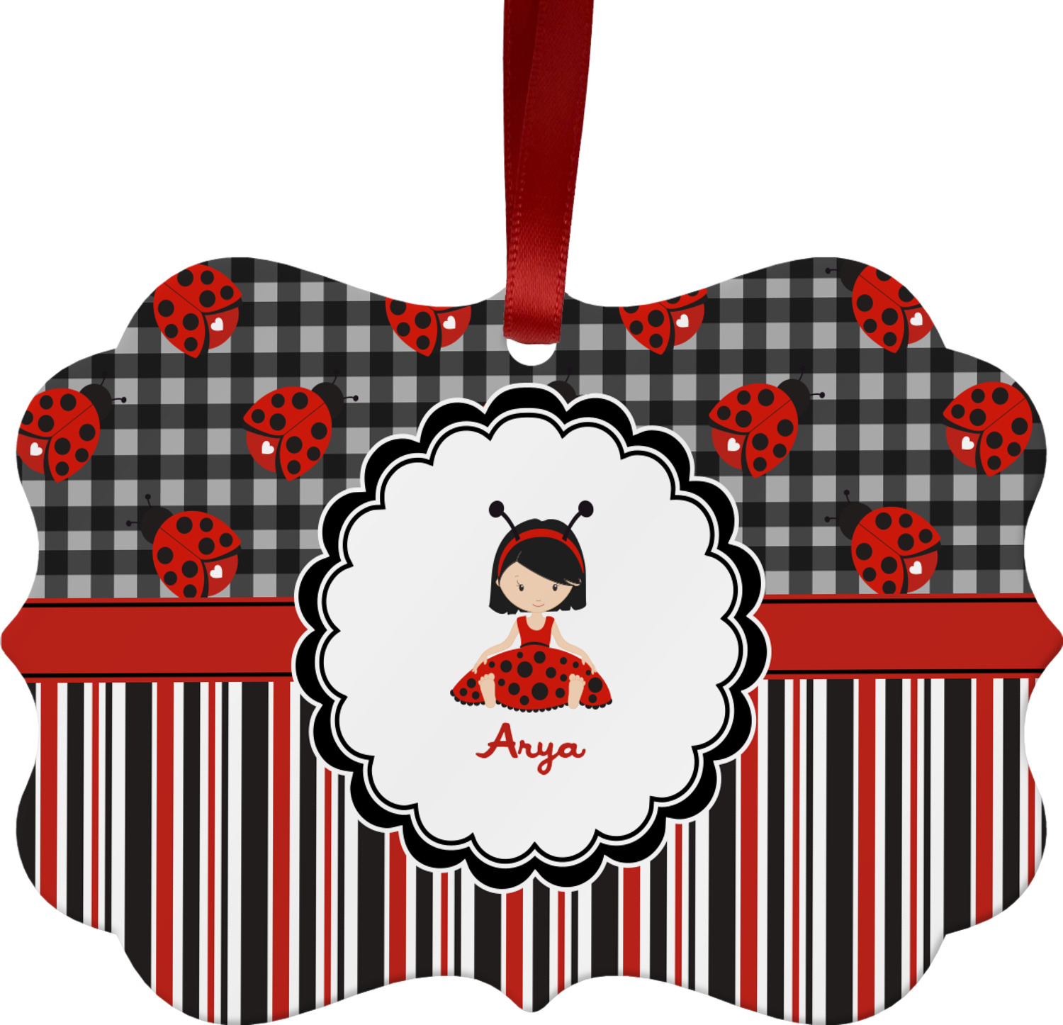 A wide band of red with an inset of black trim pulls the design together. A cute little girl dressed as a ladybug sits in the middle of a white scalloped circle label that is trimmed in double rows of black. Under the ladybug girl is ample room for custom personalization.