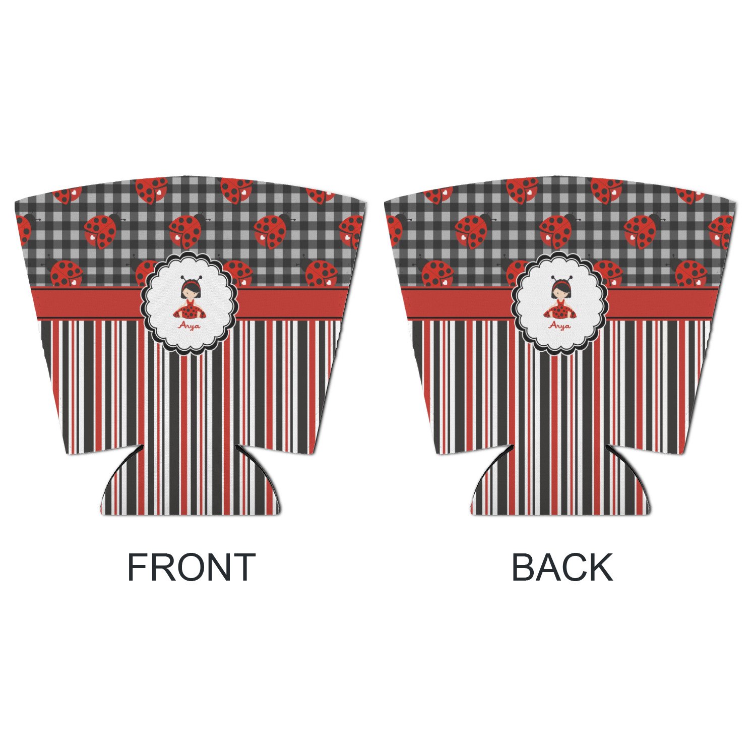 A wide band of red with an inset of black trim pulls the design together. A cute little girl dressed as a ladybug sits in the middle of a white scalloped circle label that is trimmed in double rows of black. Under the ladybug girl is ample room for custom personalization.