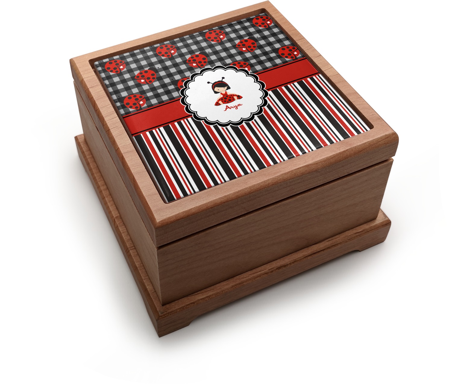 A wide band of red with an inset of black trim pulls the design together. A cute little girl dressed as a ladybug sits in the middle of a white scalloped circle label that is trimmed in double rows of black. Under the ladybug girl is ample room for custom personalization.