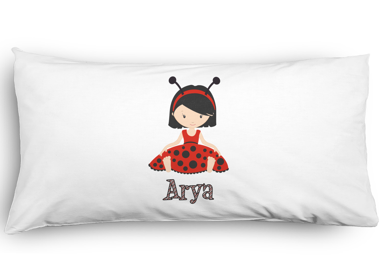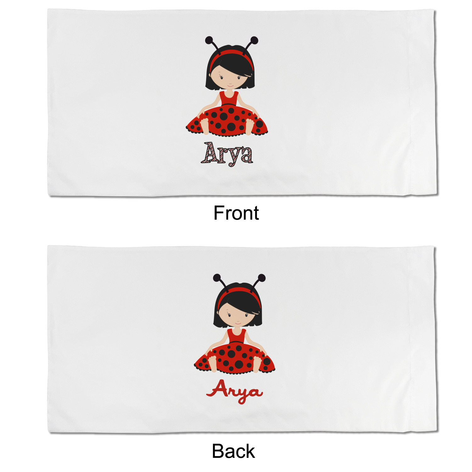 A wide band of red with an inset of black trim pulls the design together. A cute little girl dressed as a ladybug sits in the middle of a white scalloped circle label that is trimmed in double rows of black. Under the ladybug girl is ample room for custom personalization.