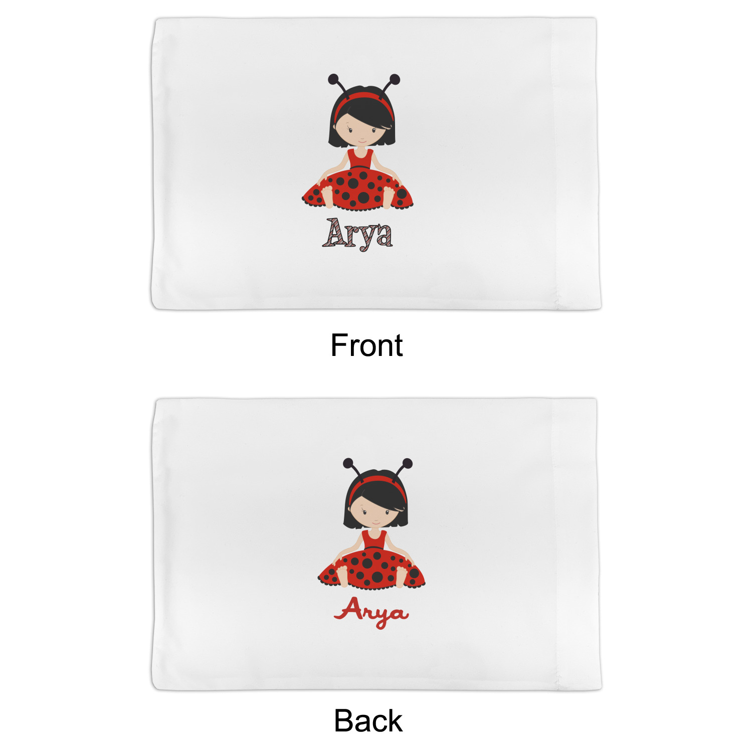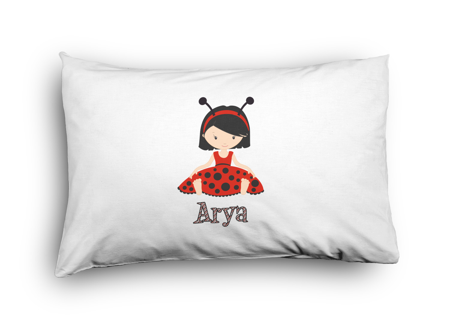 A wide band of red with an inset of black trim pulls the design together. A cute little girl dressed as a ladybug sits in the middle of a white scalloped circle label that is trimmed in double rows of black. Under the ladybug girl is ample room for custom personalization.