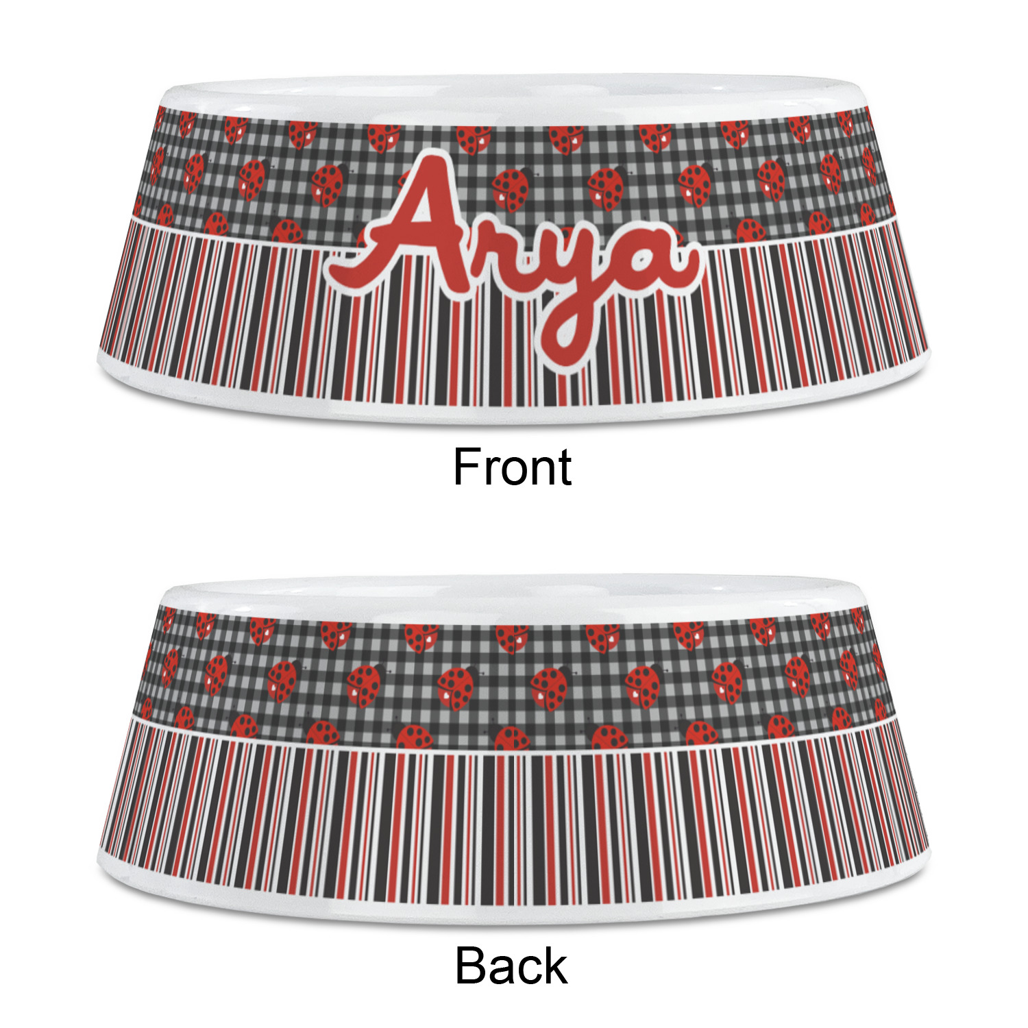 A wide band of red with an inset of black trim pulls the design together. A cute little girl dressed as a ladybug sits in the middle of a white scalloped circle label that is trimmed in double rows of black. Under the ladybug girl is ample room for custom personalization.