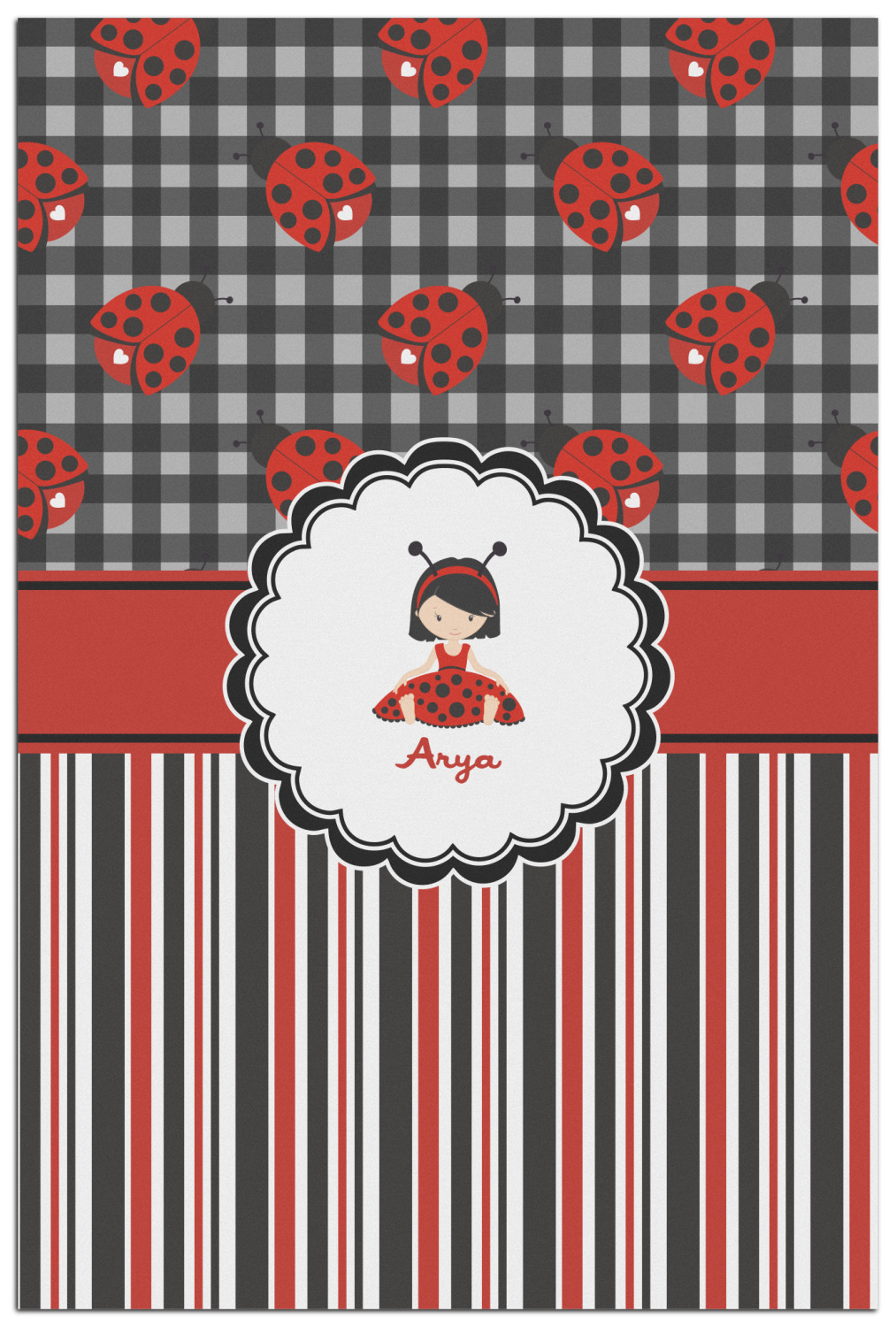 A wide band of red with an inset of black trim pulls the design together. A cute little girl dressed as a ladybug sits in the middle of a white scalloped circle label that is trimmed in double rows of black. Under the ladybug girl is ample room for custom personalization.