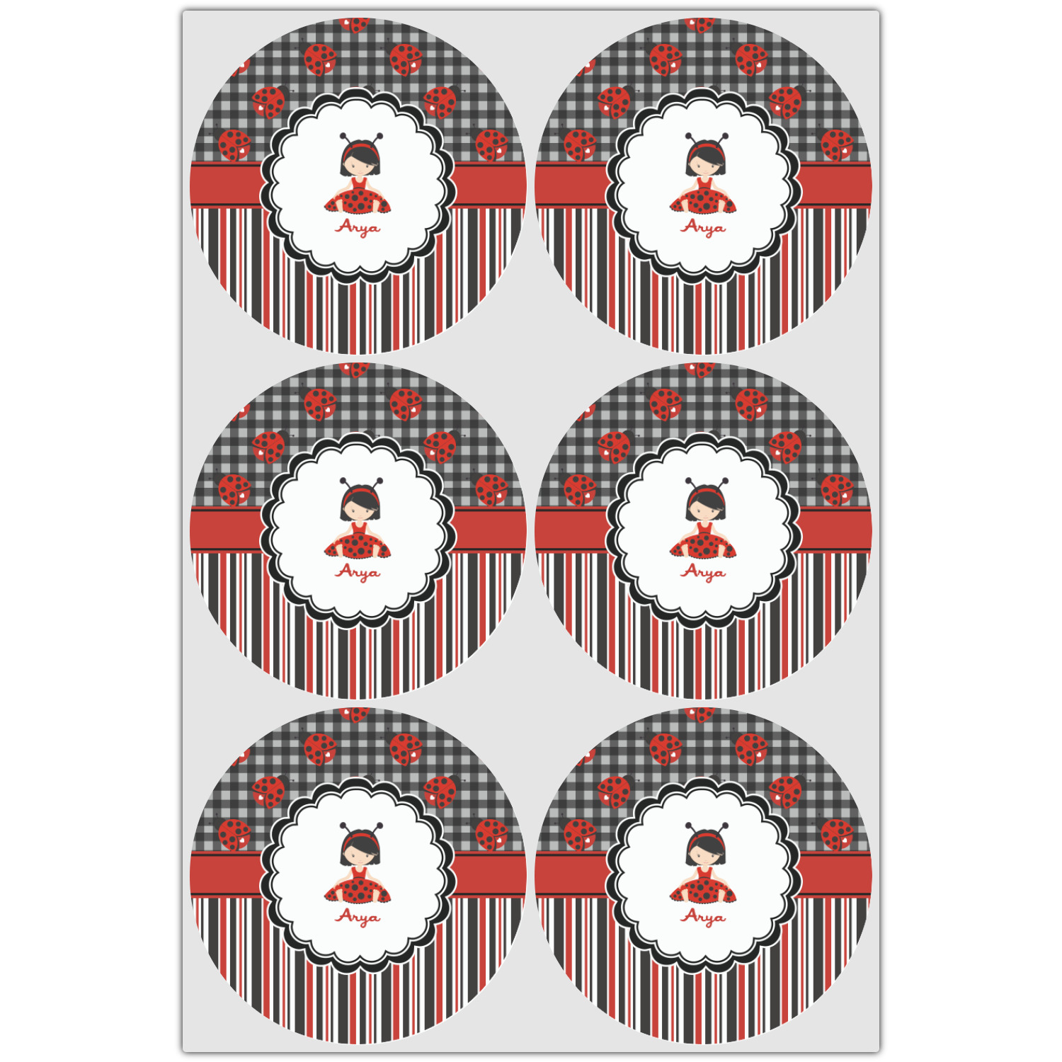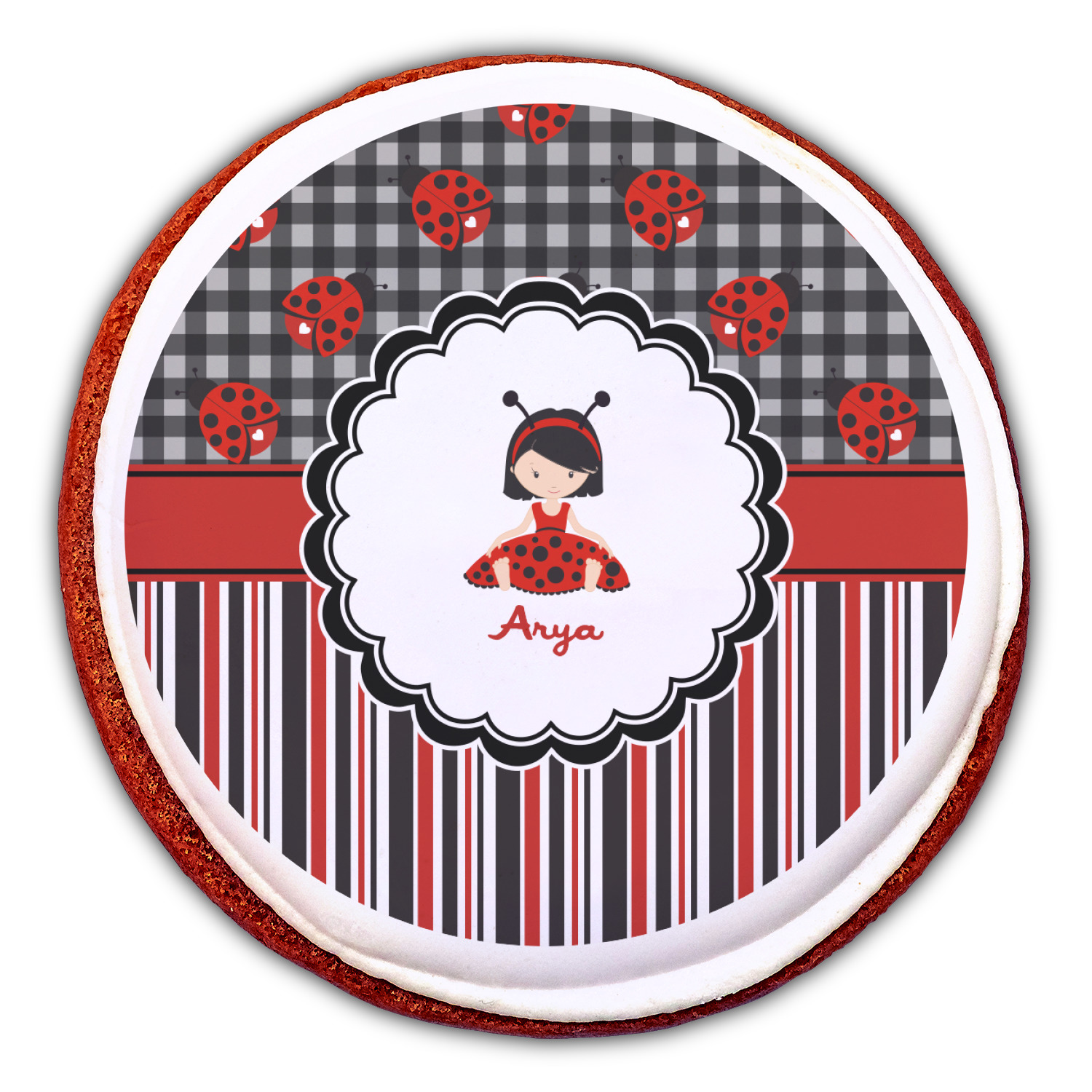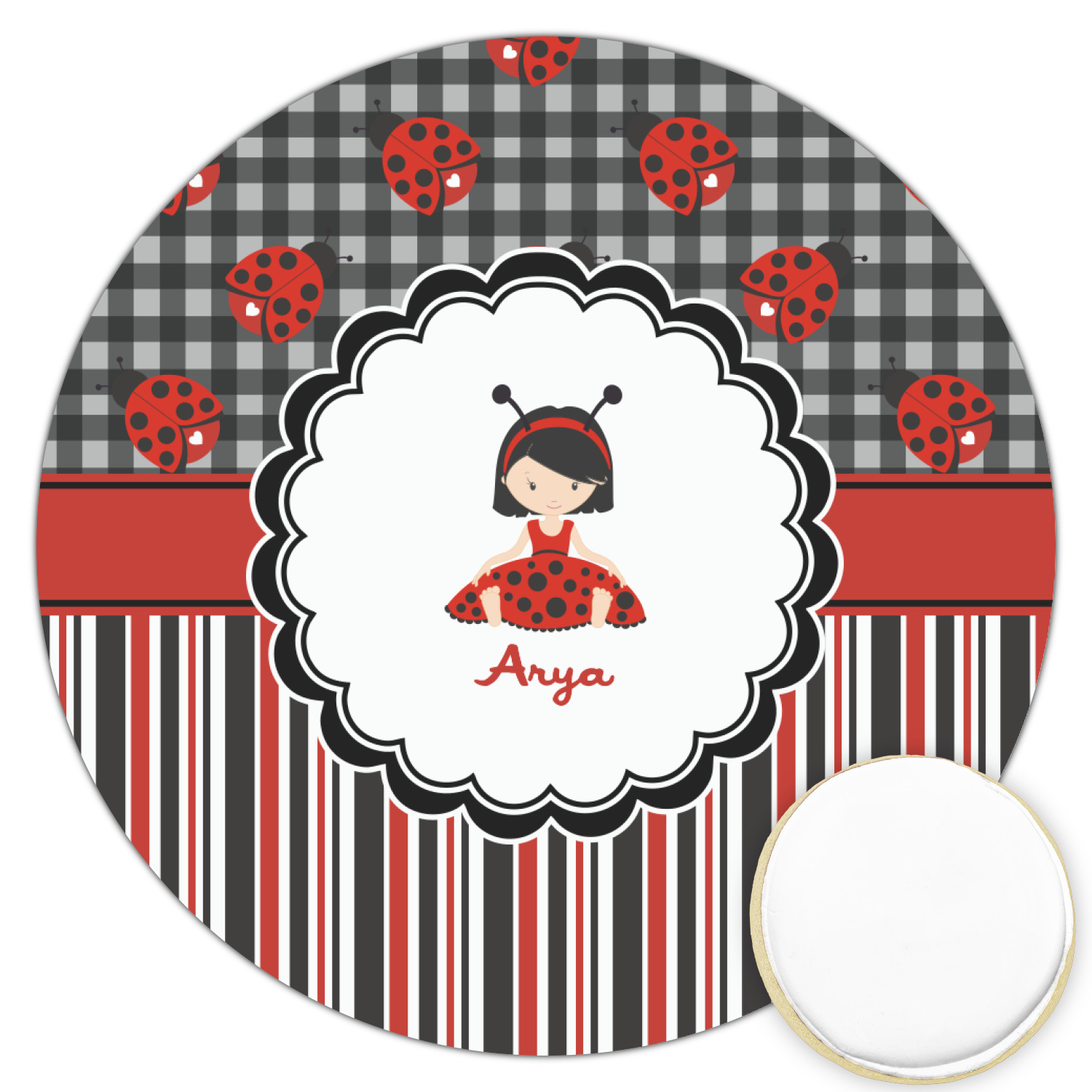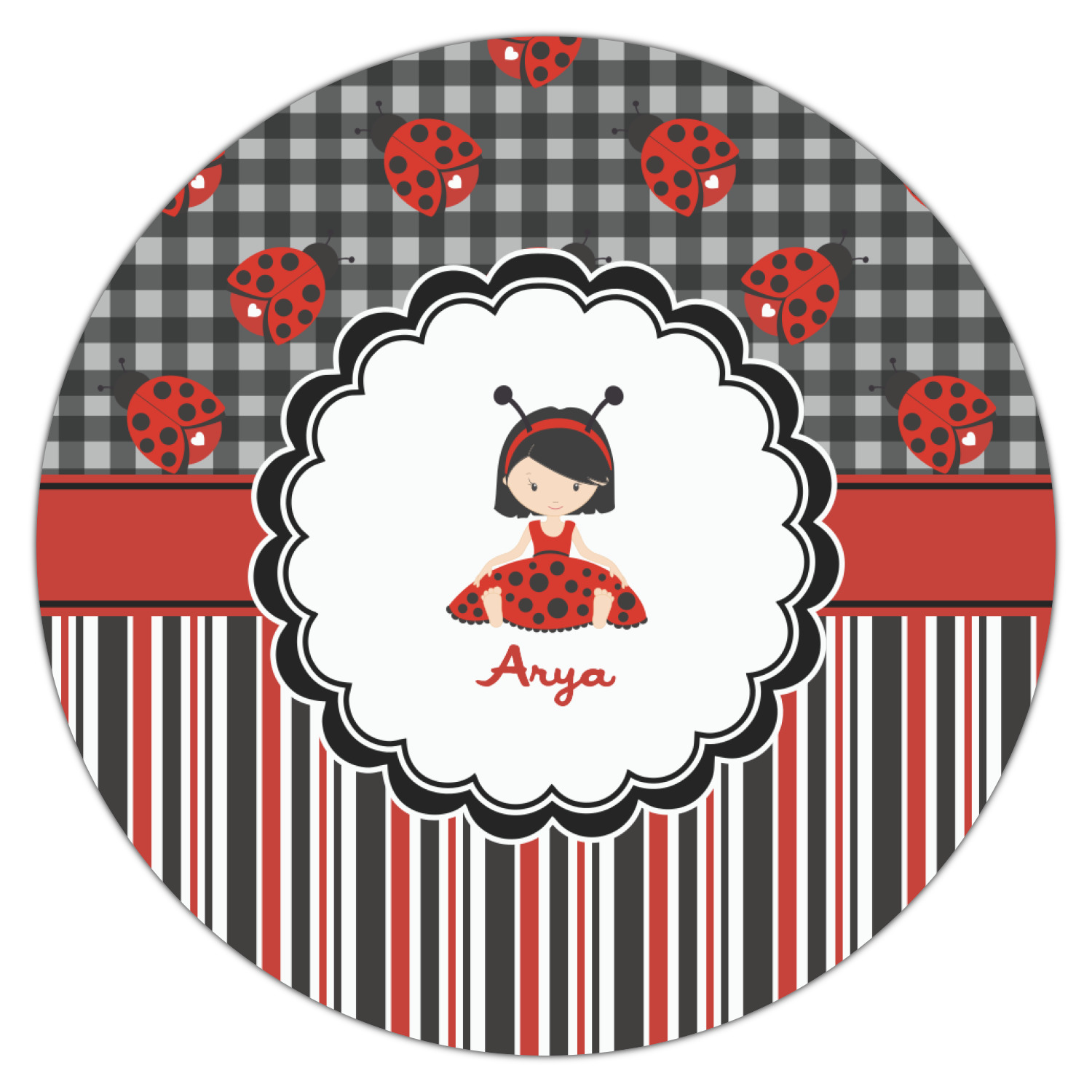 A wide band of red with an inset of black trim pulls the design together. A cute little girl dressed as a ladybug sits in the middle of a white scalloped circle label that is trimmed in double rows of black. Under the ladybug girl is ample room for custom personalization.