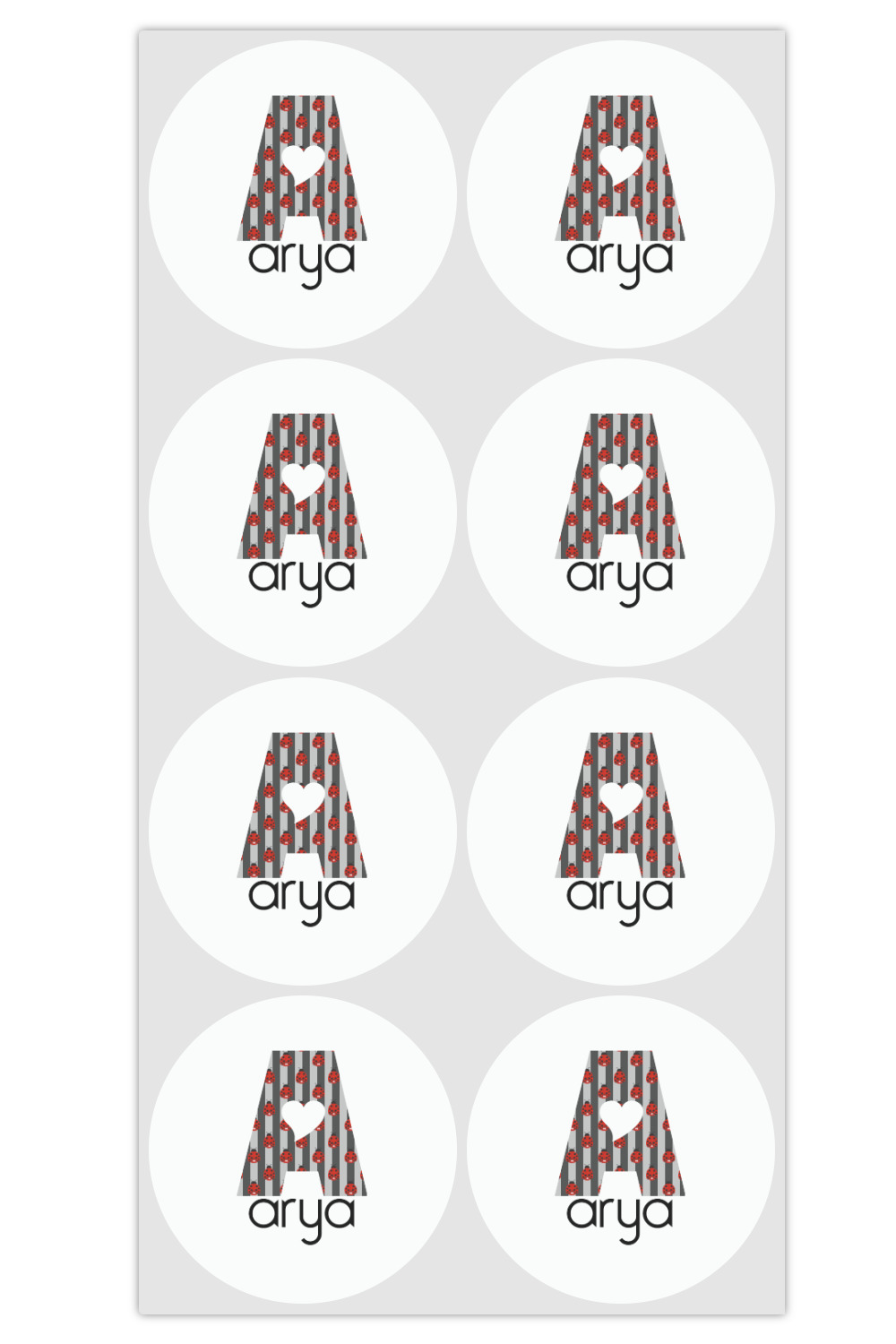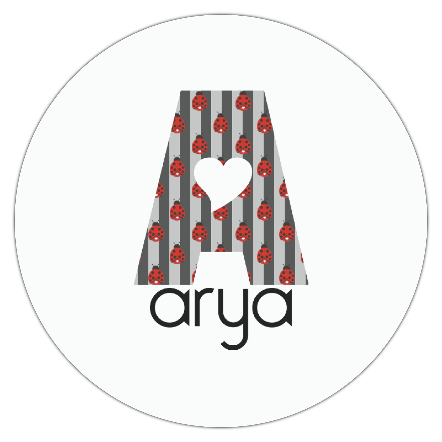 A wide band of red with an inset of black trim pulls the design together. A cute little girl dressed as a ladybug sits in the middle of a white scalloped circle label that is trimmed in double rows of black. Under the ladybug girl is ample room for custom personalization.