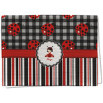 A wide band of red with an inset of black trim pulls the design together. A cute little girl dressed as a ladybug sits in the middle of a white scalloped circle label that is trimmed in double rows of black. Under the ladybug girl is ample room for custom personalization.