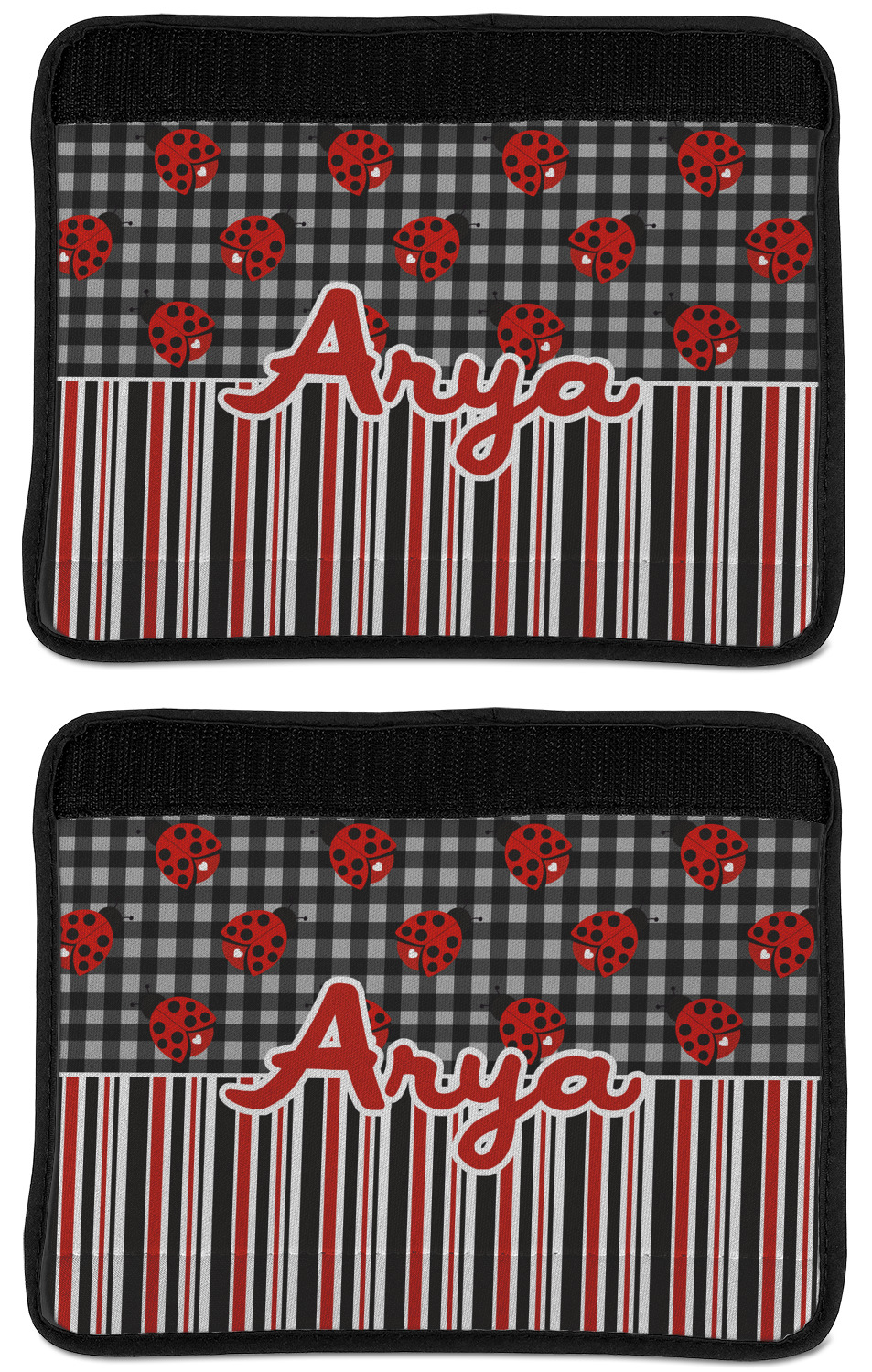 Made from neoprene, our seat belt strap covers wrap around the belt itself and have a Velcro tab for easy attachment and closure. The belt's edges are trimmed with a black polyester for a secure finish. Each cover is 9.5 by 7 inches when open and 9.5 by 2.5 inches when closed. We print your personalized design on the face of the seat belt pad.