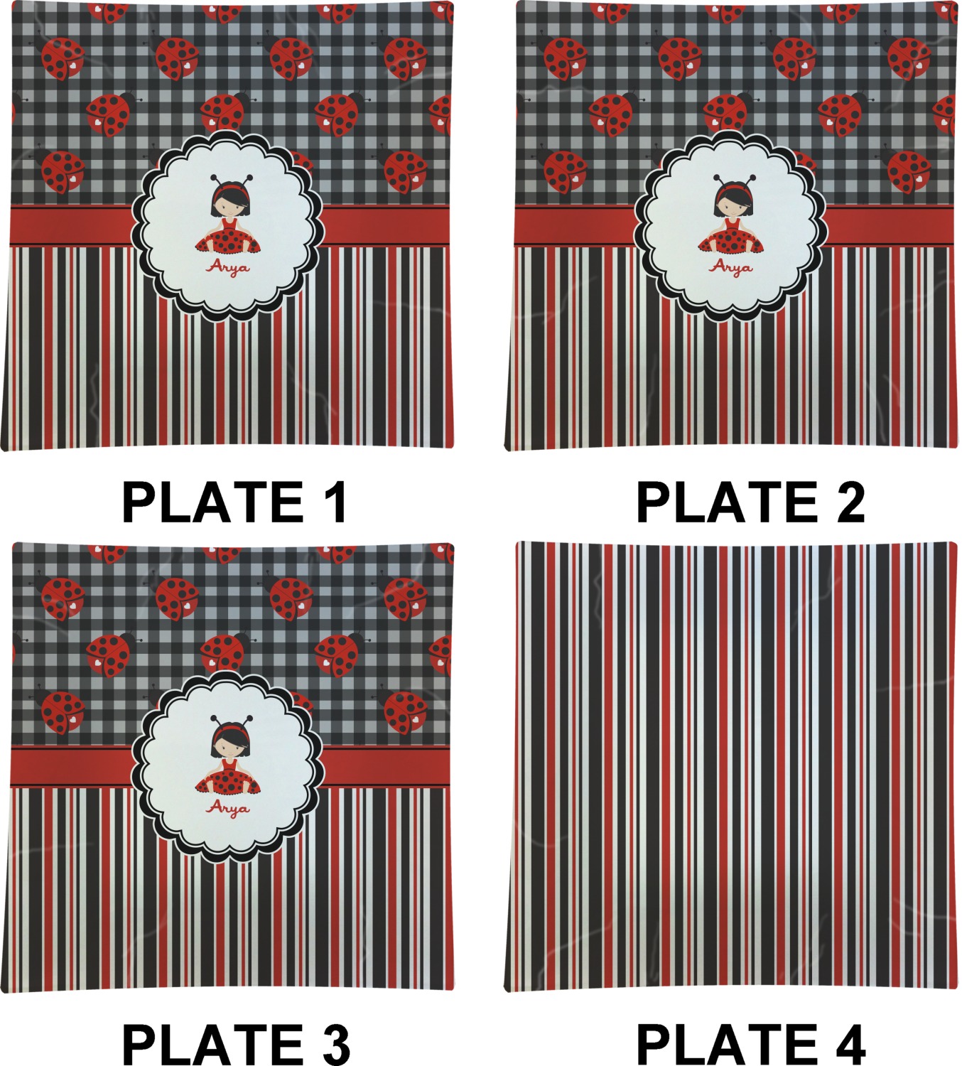 A wide band of red with an inset of black trim pulls the design together. A cute little girl dressed as a ladybug sits in the middle of a white scalloped circle label that is trimmed in double rows of black. Under the ladybug girl is ample room for custom personalization.