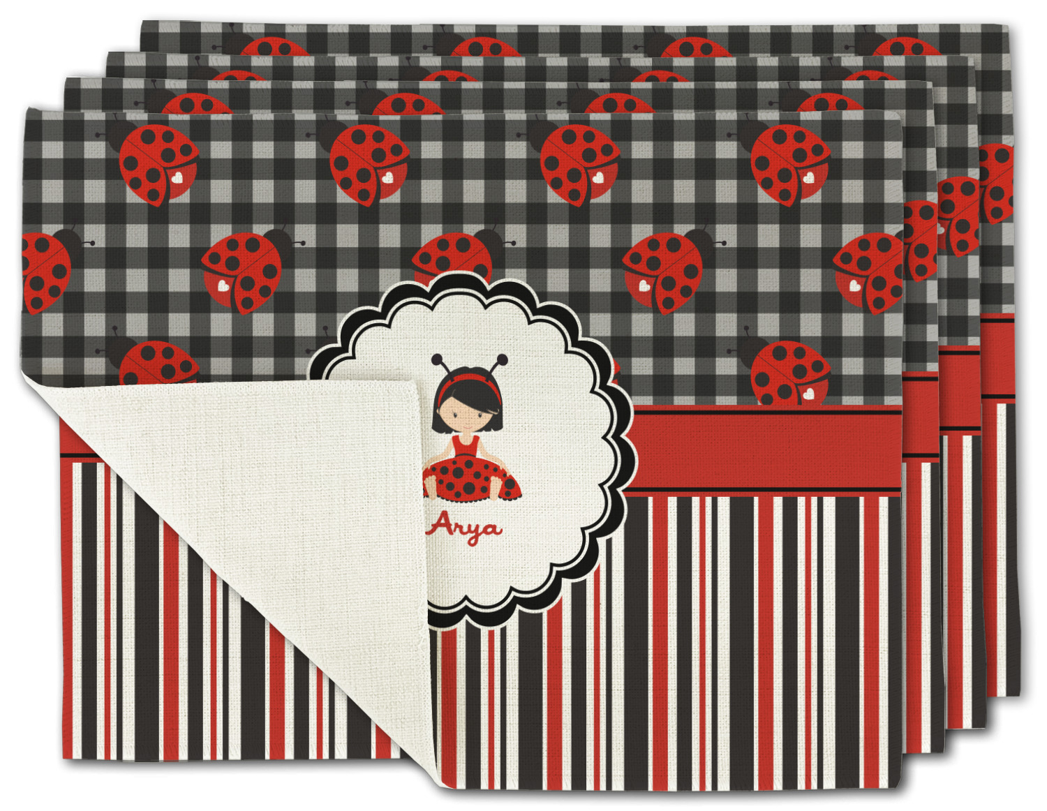 A wide band of red with an inset of black trim pulls the design together. A cute little girl dressed as a ladybug sits in the middle of a white scalloped circle label that is trimmed in double rows of black. Under the ladybug girl is ample room for custom personalization.