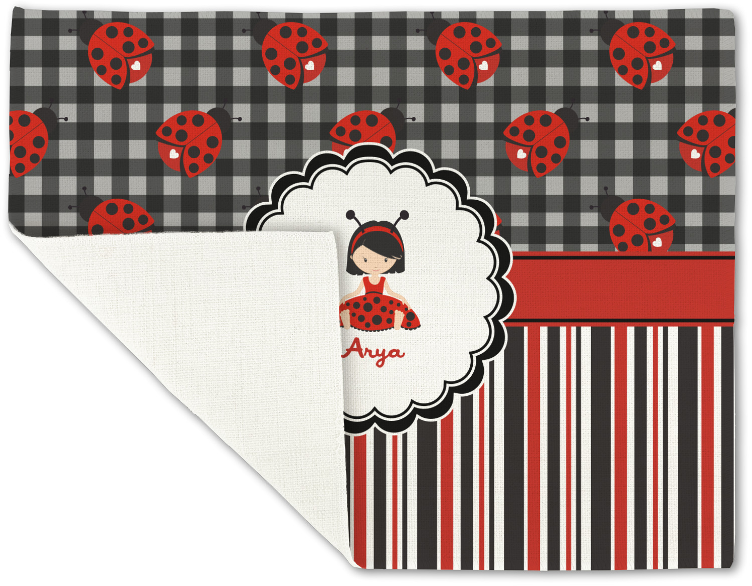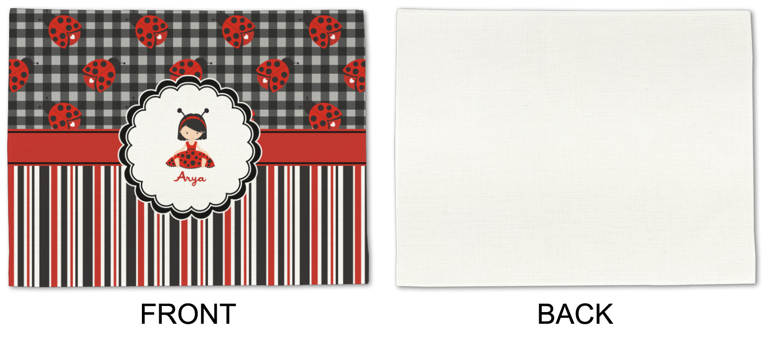 A wide band of red with an inset of black trim pulls the design together. A cute little girl dressed as a ladybug sits in the middle of a white scalloped circle label that is trimmed in double rows of black. Under the ladybug girl is ample room for custom personalization.