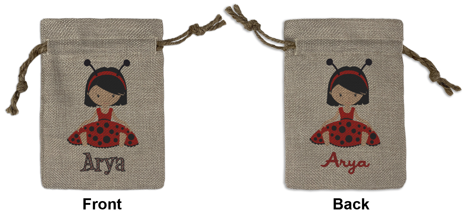 We sell our Burlap Gift Bags in 3 variant sized bags. Made with burlap polyester, each personalized bag can be secured with a twine drawstring pull. Your custom design is available to print on one side or both sides - completely up to you! The sizes of the bags measure approximately 4.5" x 6.5" for the smallest size, 6.5" x 8.0" for the medium size, and 6.5" x 13.5" for the large-sized bag.