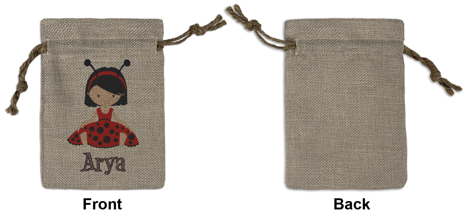 We sell our Burlap Gift Bags in 3 variant sized bags. Made with burlap polyester, each personalized bag can be secured with a twine drawstring pull. Your custom design is available to print on one side or both sides - completely up to you! The sizes of the bags measure approximately 4.5" x 6.5" for the smallest size, 6.5" x 8.0" for the medium size, and 6.5" x 13.5" for the large-sized bag.