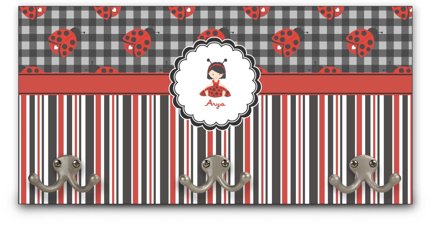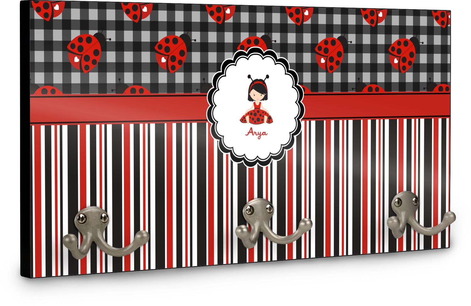 This coat rack is the perfect way to add some personality to your wall or entryway. The board is made of a strong maple that is approximately 16" x 8". The three 2-prong hooks are a sturdy metal that have three screws attaching them to the board. Your design is printed right onto the front of the board while the back and sides are a simple black.