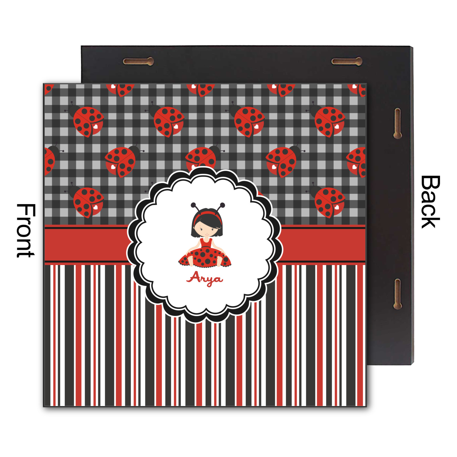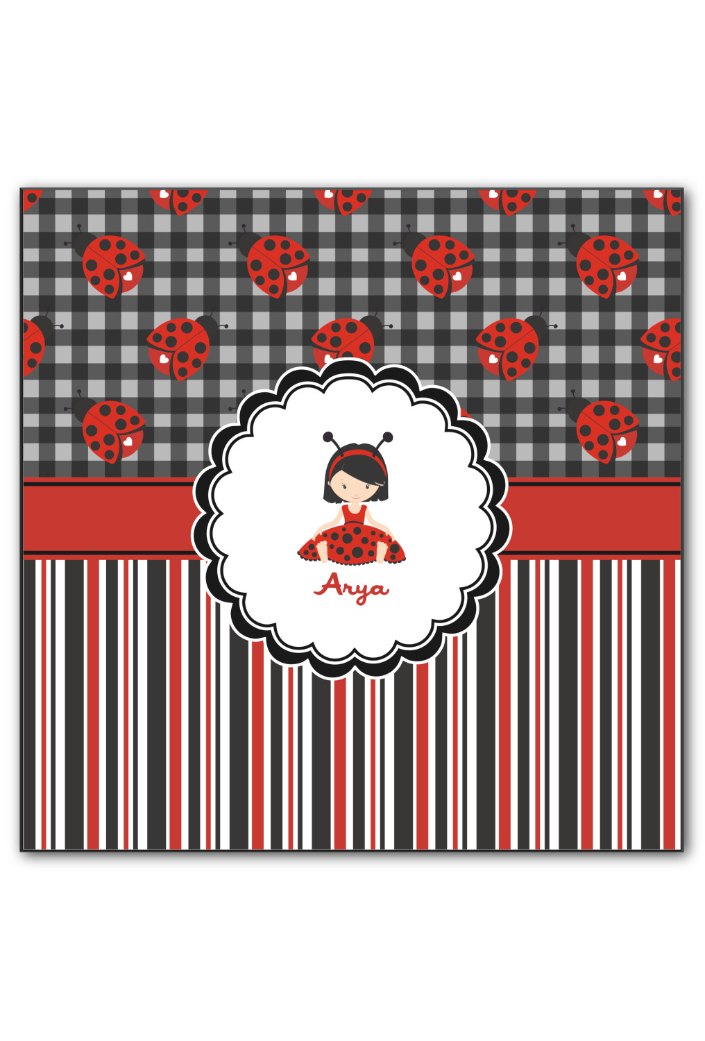 A wide band of red with an inset of black trim pulls the design together. A cute little girl dressed as a ladybug sits in the middle of a white scalloped circle label that is trimmed in double rows of black. Under the ladybug girl is ample room for custom personalization.